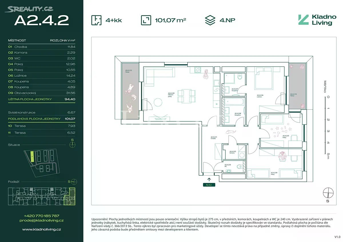 Nabízíme ke koupi moderní byt 4+kk o podlahové ploše 101 m² se dvěma terasami 7,9 a 6,5 m² v rezidenčním projektu Kladno Living, který vzniká v jedné z nejatraktivnějších lokalit města Kladno - Kročehlavy. Tento nový developerský projekt představuje jedinečnou příležitost pro ty, kteří hledají nové byty v Kladně nebo investici do nemovitosti s vysokým potenciálem zhodnocení. Projekt Kladno Living tvoří pět elegantních bytových domů (A-E) s celkem 371 jednotkami a nabízí ideální spojení klidného bydlení v zeleni a skvělé dopravní dostupnosti. Rezidenti ocení kromě plné občanské vybavenosti v okolí i vlastní sousedskou zahradu, dětské hřiště, okolní lesopark Nové Boroviny i výborné napojení na Prahu a Letiště Václava Havla. Zastávka MHD Pražská křižovatka se nachází přímo u projektu - do centra Kladna se dostanete během pár minut a na pražské metro Nádraží Veleslavín za přibližně 25 minut. Byty na prodej v Kročehlavech jsou navrženy s důrazem na funkčnost, úsporu energií a maximální komfort. Od útulných 1+kk po prostorné rodinné 4+kk - každý byt disponuje efektivním dispozičním řešením a dostatkem úložného prostoru. Většina jednotek nabízí balkon, terasu nebo předzahrádku, které rozšiřují obytný prostor. Součástí projektu je dostatek parkovacích míst a sklepních kójí. Nízkoenergetický projekt Kladno Living (PENB B) dbá na udržitelnost a moderní technologie - byty disponují rekuperačním systémem, úsporným podlahovým vytápěním a přípravou pro venkovní hliníkové žaluzie. Chybět nebudou fotovoltaické panely ani zelené střechy. Díky těmto řešením nabízí byty zdravé a komfortní vnitřní prostředí s dostatkem přirozeného světla a nízkými provozními náklady. Vysoký standard vybavení zahrnuje kvalitní vinylové podlahy, designové keramické obklady a dlažby (60x60 cm), zvýšené stropy v obývacích místnostech (2 750 mm), plastová okna s izolačním trojsklem, bezfalcové interiérové dveře s magnetickými zámky a kvalitní sanitu s bateriemi značky Gröhe. Kladno Living - moderní bydlení blízko Prahy, kde klid, prostor a pohodlí tvoří nový standard života. Prodej projektu probíhá ve třech etapách. Kolaudace 1. etapy (budovy A a B) je plánována na podzim roku 2027.
