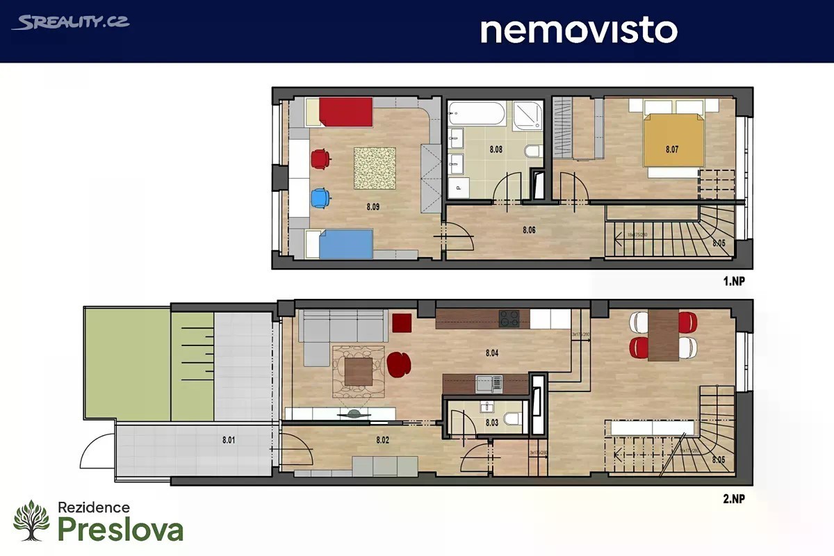 Poslední nové byty NA PRODEJ v developerském projektu Rezidence Preslova, který se nachází v centru Ostravy u parku Komenského sady. Zažijte prostor, komfort a bezpečí. Hlavní výhody projektu: - máme zkolaudováno = nastěhování ihned - dřevěná okna s trojskly a venkovními žaluziemi - kvalitní dřevěná podlaha a keramická dlažba - komfortní podlahové vytápění s termostatem - možno dokoupit garážové stání a sklep Rodinná bytová jednotka č. 8. Byt typu mezonet, je umístěný do 1. NP a druhého nadzemního podlaží. Celková podlahová plocha 118 m2 nabídne obývací pokoj s kuchyní a jídelnou o výměře 49 m2 se vstupem na terasu a oplocenou předzahrádku. Užívejte si nadstandardní komfort a prostor. Celkem dva pokoje. Jeden o výměře 21 m2 a druhý o výměře 16 m2. Podlahové vytápění má ovládání v každé místnosti. Koupelna nabídne vanu i sprchový kout. Jistě oceníte dvě toalety a maximální soukromí díky elektricky ovládaným venkovním žaluziím. Rezidence nabízí podzemní parkování, garážové stání je možno dokoupit za cenu 429.900,- vč. DPH. Zakoupit si můžete také prostorný sklep. Vše potřebné od obchodů, restaurací, zdravotního střediska nebo koníčků pro děti máte v docházkové vzdálenosti. Tenisové kurty, sportoviště, Komenského sady, vnitřní bazén i venkovní koupaliště pouhých 5 minut chůze od domu. V okolí se nachází prestižní 1st International School of Ostrava, základní i mateřská škola, vyhlášené Matiční gymnázium a Ostravská univerzita. Kontaktujte výhradního prodejce, společnost NEMOVISTO a domluvte si osobní prohlídku bytů ještě dnes.