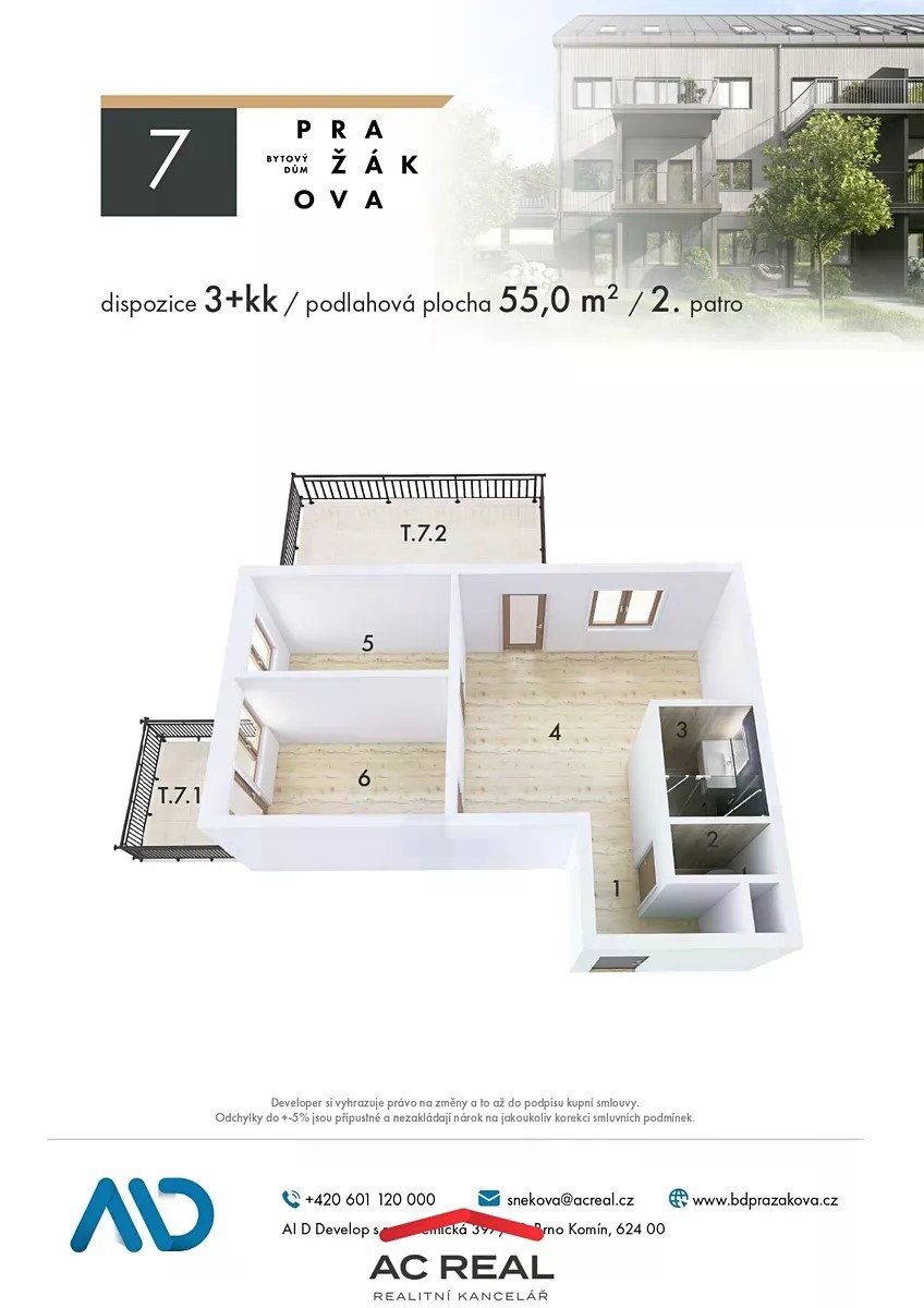 Prostorný 3+kk s dvěma terasami v projektu Pražákova - ideální bydlení pro rodinu Hledáte komfortní a moderní bydlení pro rodinu v atraktivní lokalitě? Nabízíme krásný byt 3+kk v novostavbě na ulici Pražákova, který vyniká dvěma terasami a promyšlenou dispozicí. Dispozice a výhody bytu: Bytem vás provede vstupní chodba se zádveřím, kde je prostor pro šatnu, a koupelna s odděleným WC. Hlavní obytný prostor tvoří prostorný obývací pokoj s kuchyní a přímým vstupem na velkou terasu o rozloze 29 m² - ideální místo pro rodinné posezení, relaxaci i letní grilování. Druhá, menší terasa (8 m²), je přístupná z ložnice a poskytuje soukromý kout pro rodiče. Výjimečná nabídka za zahajovací ceny! Bytový dům Pražákova je součástí uzavřeného areálu s inteligentními technologiemi a energetickou úsporností. K dispozici jsou parkovací i garážová stání a sklepní kóje. Skvělá lokalita - v blízkosti univerzitního Campusu v Bohunicích, Spielberk Office Centra a s rychlým napojením na D1, D2 i do centra Brna. Vybavení bytu: Elektronicky ovládané vstupní dveře pro maximální pohodlí a bezpečnost Elektrické podlahové topení pro rovnoměrné a úsporné vytápění Rekuperace - stálý přísun čerstvého vzduchu a nižší náklady na vytápění Předokenní žaluzie pro větší soukromí a optimální teplotu v interiéru Odolná podlahová krytina SPC s bezspárovou technologií pokládky Designové obklady a zařizovací předměty prémiových značek Kaldewei, Villeroy & Boch Chytrý vstup do domu Zapomeňte na klíče - vstupte pohodlně pomocí čipu, aplikace nebo rozpoznání obličeje. V případě ztráty čipu jej jednoduše zablokujete přes aplikaci. Termín dokončení: červen 2026 Pokud Vám tento byt nevyhovuje, neváhejte nás kontaktovat - v nabídce máme i další byty různých velikostí. Rádi Vám celý projekt osobně představíme u dobré kávy.