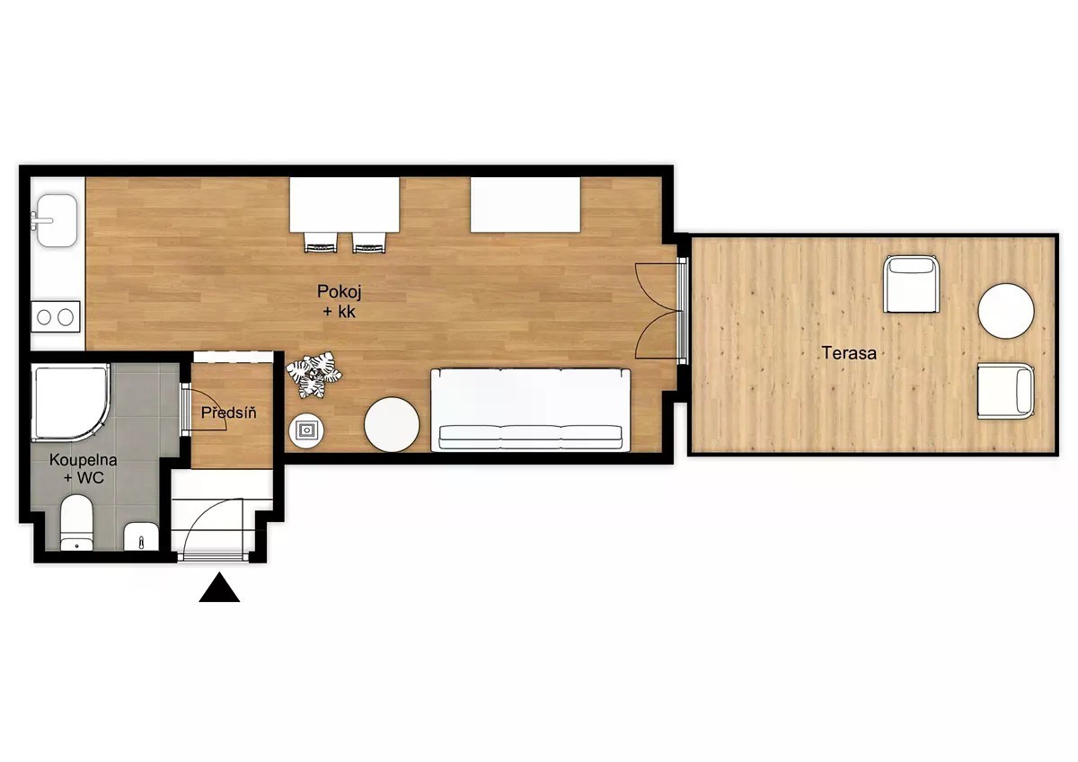 Představujeme vám moderní byt 1+kk v 2.NP s prostornou terasou. Nachází se v cihlovém čtyřpatrovém domě. Čistá bytová plocha činí 26,5 m² + terasa 10 m² + sklep 3 m². Velká francouzská okna zajišťují v celém interiéru dostatek přirozeného světla. Najdete zde kuchyňský kout s moderní linkou, podlahové topení a vstup na krásnou terasu. Ta je částečně obklopena vzrostlou zelení a poskytuje dostatek soukromí. Do koupelny se sprchovým koutem vstupujete z předsíně. Byt se prodává nezařízený. Můžete si ho tak upravit podle vlastních představ. Klidná lokalita Komořany je obklopena přírodou s Vltavou na dosah. Nedaleko najdete přírodní památku Komořanské a modřanské tůně. Dobrá dostupnost do centra, MHD v dosahu a rozvíjející se občanská dostupnost tak zajišťují ideální místo pro bydlení a relaxaci.