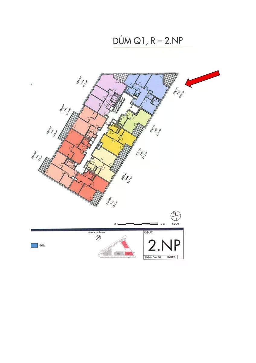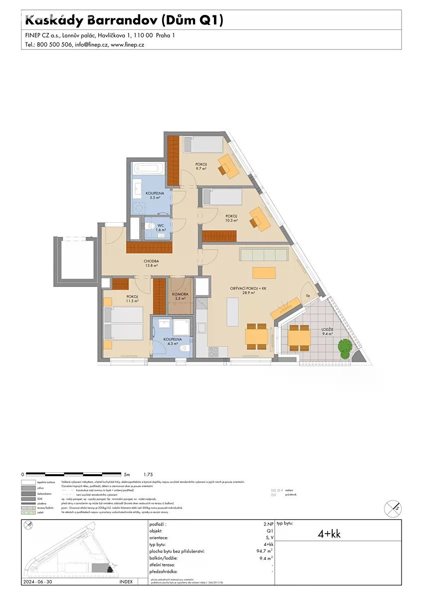 Postoupíme družstevní byt 4+kk v projektu Kaskády Barrandov, Praha 5. Budova Q1, ulice Gollová. Developer: Finep. Velice zajímavý a atypický byt - viz půdorys v příloze. Předmětem převodu je členský podíl v družstvu zahrnující: 1. Byt 4+kk, podlahová plocha 94,7 m2 + 2. Terasa, plocha 9,4 m2 + 3. *Rozšířené* podzemní parkovací místo pro 1 automobil (v ceně převodu). Byt se nachází ve 2. nadzemním podlaží ze 6. Orientace V/S. Stav: ve výstavbě. Plánovaná kolaudace: 12/2027. Klientské změny jsou možné do Q1/2026. Developer poskytuje záruku 3 roky na byt po jeho předání. Dispozice bytu: obývací pokoj s kuchyňským koutem (29m2), 3x neprůchozí pokoj (10m2, 10m2, 11.5m2), koupelna s vanou (WC samostatně), druhá koupelna se sprchovým koutem a WC, komora v bytě, chodba (14m2) a terasa (9,5m2). Celková cena bytu s garážovým stáním je 15.942.000 Kč a skládá se ze dvou částí: 1. Cena za postoupení (byt + parking): 4.650.000 Kč - platíte nyní (vlastní zdroje). 2. Anuita ve výši 11.292.000 Kč se splácí po dobu 30ti let ve formě měsíčních splátek 62.400 Kč. Splácí se až po kolaudaci, po převzetí bytu, přibližně od ledna 2028. Stavbu úvěruje družstvo, Vy nepotřebujete hypotéku ani nedokládáte příjem. Po dobu výstavby není možný převod do OV.