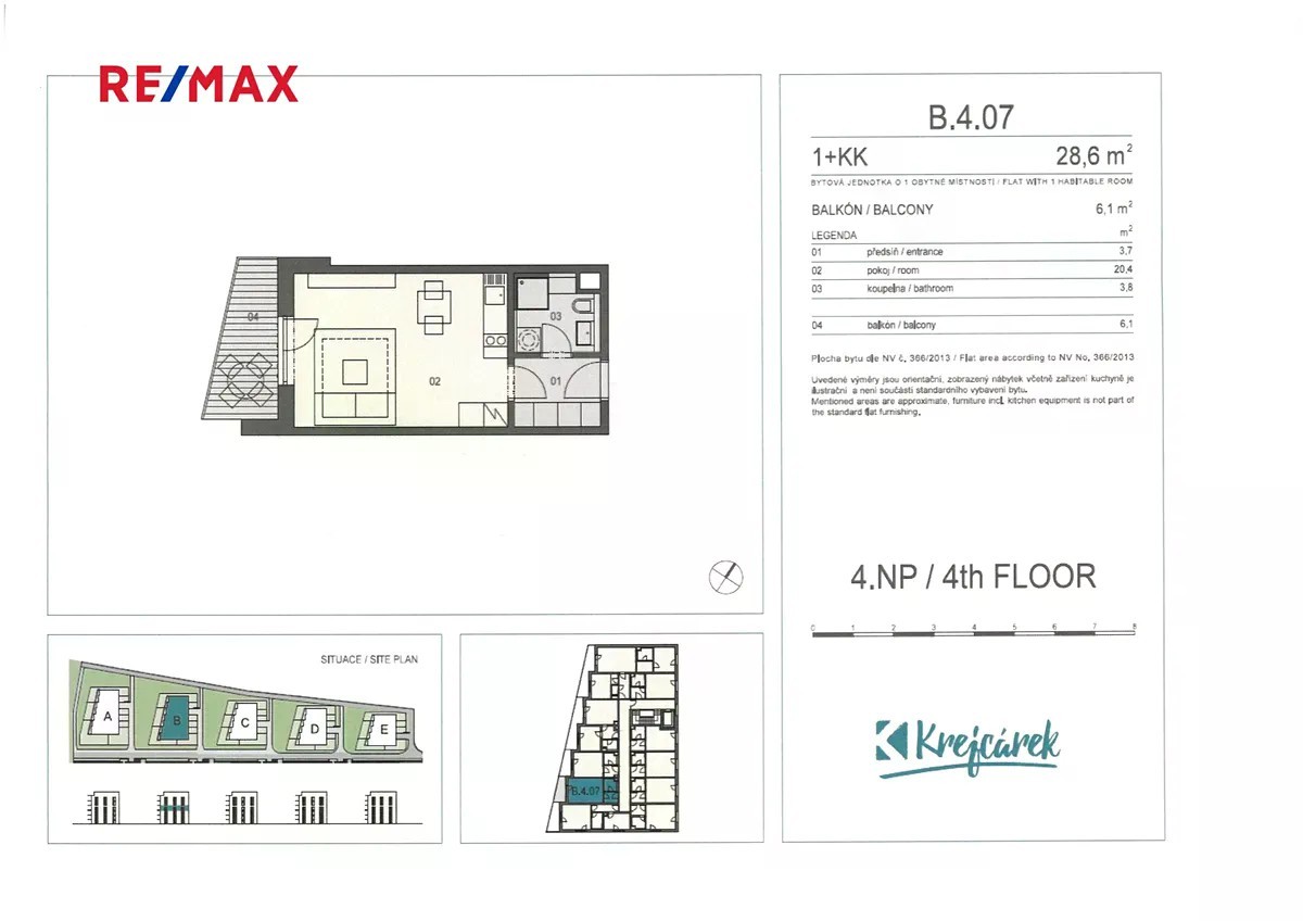 Nabízím k prodeji světlý a částečně vybavený byt 1+kk o celkové ploše 34,7 m² (obytná část 28,6 m² + balkon 6,1 m²), jenž má k dispozici sklepní kóji (3,5 m²) a vlastní garážové stání. Byt se nachází ve 4. patře moderní novostavby Rezidence Krejcárek v ulici Novovysočanská, v žádané a perfektně dostupné lokalitě Praha 9 - Libeň. Byt tvoří vstupní chodba s vestavěnou skříní, která zajišťuje dostatek úložného prostoru. Koupelna je vybavená sprchovým koutem, toaletou, umyvadlem se zrcadlem a přípojkou na pračku i sušičku. Hlavní obytný prostor propojuje moderní kuchyňský kout s barovým sezením a útulnou obývací částí. Kuchyň je plně vybavena spotřebiči - indukční varnou deskou, myčkou, digestoří a horkovzdušnou troubou. Součástí vybavení je také barový stůl se židlemi, postel a TV. Z obývací části se vstupuje na prostorný balkon s posezením, odkud je příjemný výhled do okolí. Byt je vybavený systémem rekuperace, který zajišťuje stálý přísun čerstvého vzduchu. Budova má energetickou náročnost B - velmi úsporná. Měsíční zálohy na služby za byt i garáž vycházejí celkově na 3 862,-Kč + elektřina v bytě. Rezidence Krejcárek nabízí moderní bydlení v klidné lokalitě s rychlou dostupností do centra. Přímo u domu se nachází zastávka autobusu č. 136 "Odlehlá". Stanice metra =B= Palmovka, Vysočanská i =A= Flora jsou dosažitelné do 12 minut. V blízkém okolí najdete kompletní občanskou vybavenost - nákupní centra Harfa a Fénix, Sport a Wellness centrum Step, restaurace, kavárny i zeleň pro volnočasové aktivity. Byt je ideální volbou pro vlastní bydlení nebo jako investice s možností okamžitého pronájmu. Rád se s Vámi setkám na prohlídce bytu.
