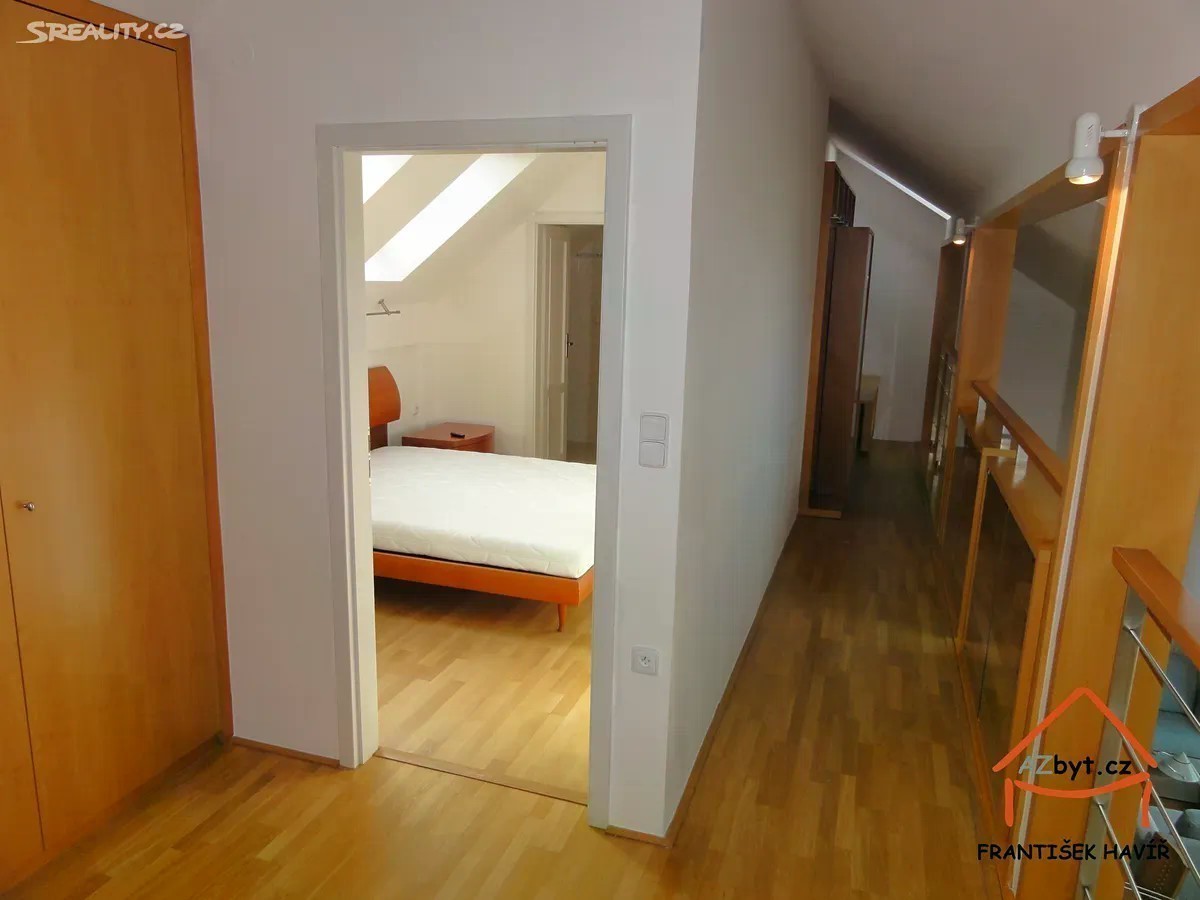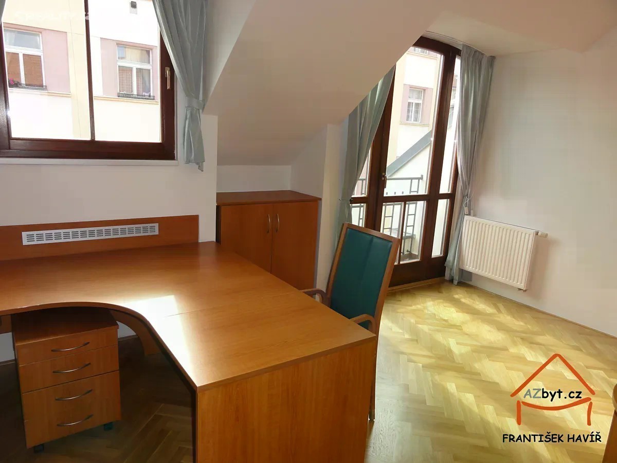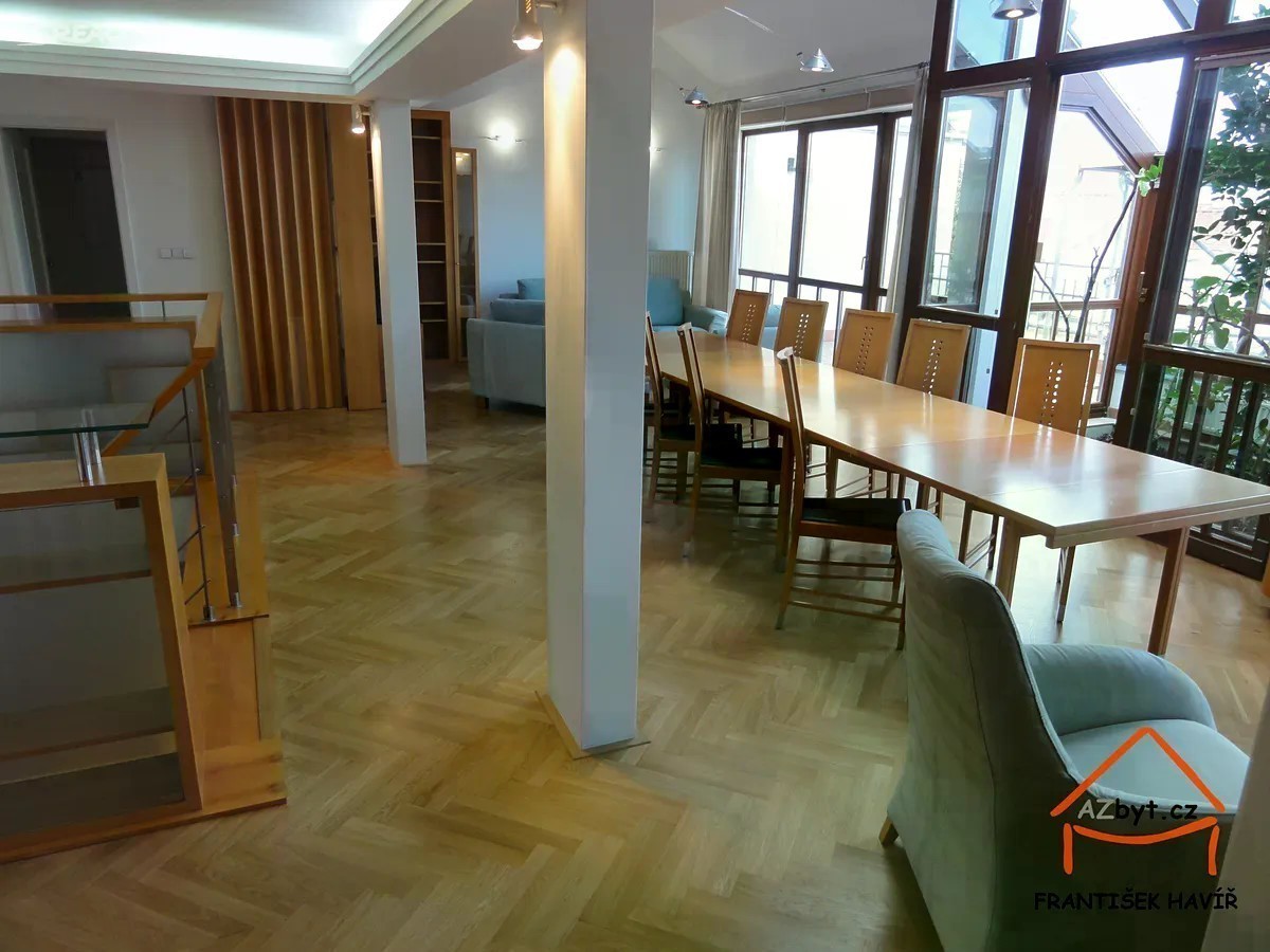 Nabízím k dlouhodobému pronájmu pěkný mezonetový byt o užitné ploše cca 268 m2 (dvě podlaží + galerie), který se nachází ve 3. a 4. patře cihlového domu, 5 minut od centra města. Byt se zimní zahradou a terasou s panoramatickým výhledem (Pražský hrad, Vítkov) je kompletně zařízen (fotografie) včetně nově vybavené kuchyně a nových matrací. Dolní podlaží tvoří tři pokoje (20+20+22 m2), 2x koupelna, 2x toaleta, šatna, balkon, technická místnost, předsíň a schodiště. Horní podlaží se skládá z prostorného obývacího pokoje (57 m2) s krbem, zimní zahrady, terasy, kuchyně, pracovny a toalety. Vstup po dřevěném schodišti na galerii s pokojem, koupelnou a toaletou. Dispozice na přiložených půdorysech. Vytápění bytu a ohřev vody zajišťují tři plynové kotle, v technické místnosti automatická pračka. Na podlahách parkety a dlažba. Možnost internetu. Prostory jsou kolaudované jako byt, ale lze je využít pro sídlo firmy včetně bydlení apod. (ne ke krátkodobým pronájmům). Zdarma kryté parkovací stání ve dvoře domu. V domě není výtah. Preferujeme nájemce bez zvířat. Prostory budou připraveny k pronájmu počátkem února 2026. (Průkaz energetické náročnosti budovy zatím nebyl dodán, dle zákona proto uvádím energetickou třídu G.)