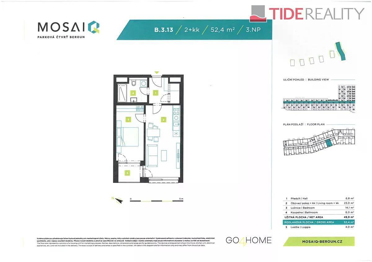 Klidné bydlení na dosah Prahy! Dokončení v roce 2027. Zahájili jsme výstavbu nových bytů v parkové čtvrti MOSAIQ Beroun. Velkoryse koncipovaný soubor bytových domů umístěných v zeleni nabídne široké rozpětí bytů od 1+kk po 5+kk s terasami, balkony či předzahrádkami. Novou obytnou čtvrť ohraničují ulice Na Máchovně a Na Morákově, domy vyrůstají v mírném svahu, který se zdvihá k vrcholu Děd. Ústřední budovou je dům s věží, na který navazuje sestava příjemných čtyřpatrových domů v zeleni. Tato západně orientovaná jednotka 2+kk s lodžií o výměře 4 m2 sestává z obývacího pokoje s kuchyňským koutem, ložnice, koupelny a předsíně. Podlahová plocha jednotky činí 52 m2 + lodžie. Standardní vybavení bytů zahrnuje plovoucí podlahy, interiérové dveře s výškou 210 cm, moderní vybavení koupelen, okna s barevným rámem a izolačním trojsklem, přípravu na vnější žaluzie. V bytech budou moderní datové rozvody formou strukturované kabeláže a přípojka STA. V projektu bude využita smart technologie pro vytápění, která pracuje se dvěma tepelnými zdroji - tepelnými čerpadly a zemním plynem. Dostatečná kapacita parkovacích míst převážně v podzemních garážích, ale i venku. Příznivé platební podmínky doplatek kupní ceny ve výši 85% je hrazen až po kolaudaci! Užijte si bydlení v blízkosti hlavního města s kompletním zázemím města Beroun a Křivoklátskem za humny. Obytný soubor MOSAIQ Beroun navazuje na stávající obytnou čtvrť jejíž součástí jsou i sportovní centra Eden, koupaliště Laguna a také tréninkové centrum fotbalové mládeže. V těsné blízkosti naleznete obchody, školy a školky. Beroun je skvělá lokalita v blízkosti hlavního města s přímým dopravním spojením do centra Prahy. Díky nedaleké dálnici jste na hranici metropole za méně než čtvrt hodiny. Vybírejte z pestré nabídky bytů, domluvte si osobní schůzku v naší pražské kanceláři.