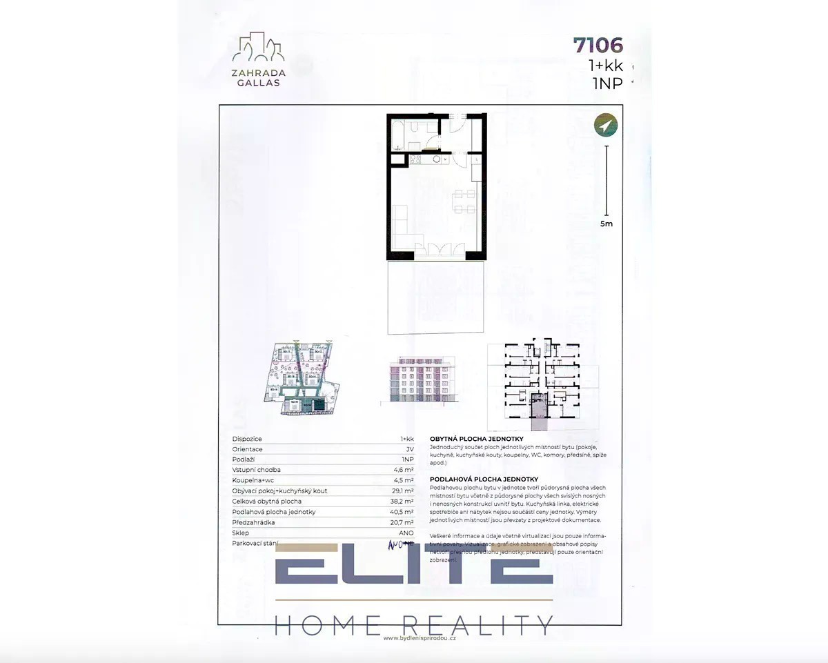 Nabízím k pronájmu byt 1+kk, 40,5 m2 s předzahrádkou 20,7 m2 v 1. NP s orientací na JV včetně garážového parkovacího stání v právě dokončeném šestipodlažním nízkoenergetickém domě v Zahradě Gallas, obklopený zelení u křížení ulic Švermova a Tovární v městské části Liberce - Františkov, vzdálené 1,5 km od centra města a zároveň 2,5 km od Přírodního parku Ještěd. Místem protéká Františkovský potok, který je v části zahrady otevřen a revitalizován. V Zahradě Gallas bude celkem 7 takových domů, které obklopuje zahrada pro odpočinek, kde zde najdete dětské i workoutové hřiště, grill pointy, plácek na jógu, pétanque, relaxační zónu pro odpočinek, nebo servis point pro kola a mnoho dalšího. Nicméně nyní probíhá ještě v zadní části výstavba. Samotný byt je vybaven kuchyňskou linkou (bude nyní probíhat instalace, vzhled linky je ve fotodokumentaci) se dřezem a baterií, varnou deskou, digestoří a troubou. Všechny místnosti mají stropní světla a nad okny jsou garnýže. V místnosti jsou velká francouzská okna. Podlahy jsou v bytě laminátové. V koupelně společné s WC je keramický obklad a dlažba, vana se sprchovou baterií, umyvadlo se světlem nad ním, komplet WC a topný žebřík s termostatickou hlavicí. K bytu náleží sklep. Ohřev vody je zajištěn ve strojovně v objektu, zdrojem tepla je teplovod z Teplárny Liberec s přípojkou teplovodu do předávací stanice v každém objektu. Topná tělesa jsou klasická desková otopná tělesa s termostatickou hlavicí. Měřidlo vody jakož i měřidlo spotřeby tepla - kalorimetr je pro každý byt s dálkovým odečtem. V objektu je kabelová televize, optický kabel. Kamery na vstupy do domu a vjezd garáže. Ideální bydlení pro 1-2 osoby, bez větších domácích mazlíčků. Pro více informaci či sjednání prohlídky kontaktujte makléřku skrze inzertní formulář