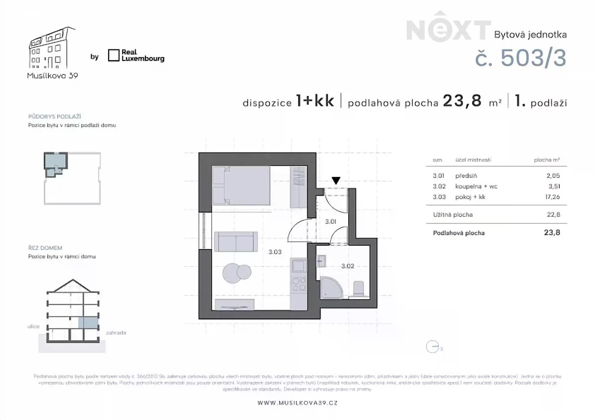 V exkluzivním zastoupení majitele vám ke koupi nabízíme byt o dispozici 1+kk, který v současné době, stejně jako celý dům, prochází kompletní kvalitní rekonstrukcí. Byt o podlahové ploše 23,8 m2 se skládá z pokoje s kuchyňským koutem (17,3 m2), předsíně (2 m2) a moderní koupelny (3,5 m2) se sprchovým koutem a WC. Je umístěn v 1. nadzemním podlaží kompletně rekonstruovaného 3 podlažního domu v ulici Musílkova, s velkým oknem s výhledem do zahrádek za domem. K domu je možné zahrádku přikoupit. Musílkova je tichá jednosměrná ulice, která se nachází v rezidenční části mezi Košířemi a Smíchovem. Ulice si zachovala svou poklidnou atmosféru, a přitom je jen pár minut tramvají od Anděla - jednoho z hlavních pražských dopravních i obchodních uzlů. Díky této výjimečné poloze je lokalita ideální pro každého, kdo hledá rovnováhu mezi ruchem velkoměsta a klidem domova. Bydlení zde je vhodné pro mladé páry, jednotlivce, seniory i rodiny s dětmi. Z důvodu prací na bytě i domě, jsou v inzerci použity vizualizace budoucího stavu. Pokud Vás nabídka oslovila, neváhejte mě kontaktovat pro bližší informace. V případě potřeby vám rádi pomůžeme s vyřešením financování i s dalšími následnými záležitostmi. Pro komunikaci uvádějte evidenční číslo zakázky N114596.