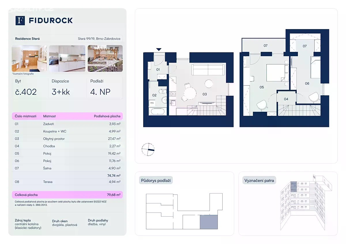 Nabízíme k prodeji krásný, světlý mezonetový byt 3+kk o velikosti 78,2 m² s terasou, nacházející se v 4. nadzemním podlaží zrekonstruovaného domu na ulici Stará 19, Brno - střed. Dům má příjemnou pavlačovou architekturu s historickým nádechem, která v sobě spojuje kouzlo starého Brna a komfort moderního bydlení. Informace o bytě: Dispozice: 3+kk, mezonet Podlahová plocha: 78,20 m² Podlaží: 4. NP (byt č. 402) Cena: 8 826 825 Kč Bez provize! Dispozice bytu - předsíň - koupelna s toaletou - obývací pokoj s plně vybavenou kuchyní (lednice s mrazákem, myčka, varná deska, trouba, digestoř) - dvě samostatné ložnice v horním patře - šatna - terasa s výhledem do klidného vnitrobloku Podlahy tvoří vinyl a dlažba, byt je po kompletní rekonstrukci. V domě je výtah, parkování možné před domem. V domě nabízíme více bytů - rádi vám e-mailem zašleme odkaz na karty bytů a kompletní ceník. Všechny byty jsou obsazené ověřenými a platícími nájemníky, což představuje skvělou investiční příležitost bez nutnosti složitého hledání vhodného nájemníka. Lokalita - Stará ulice, Brno-střed Jedna z nejžádanějších adres v centru Brna - klidná ulice Stará se nachází jen pár minut chůze od náměstí Svobody, hlavního nádraží, nebo OC Vaňkovka. V bezprostředním okolí najdete restaurace, kavárny, obchody, lékárnu, poštu i MHD. Díky své poloze je byt ideální jak pro vlastní bydlení v srdci Brna, tak jako investiční příležitost. Máte zájem o prohlídku? Kontaktujte nás e-mailem - rádi Vám poskytneme více informací nebo zašleme půdorys bytu.