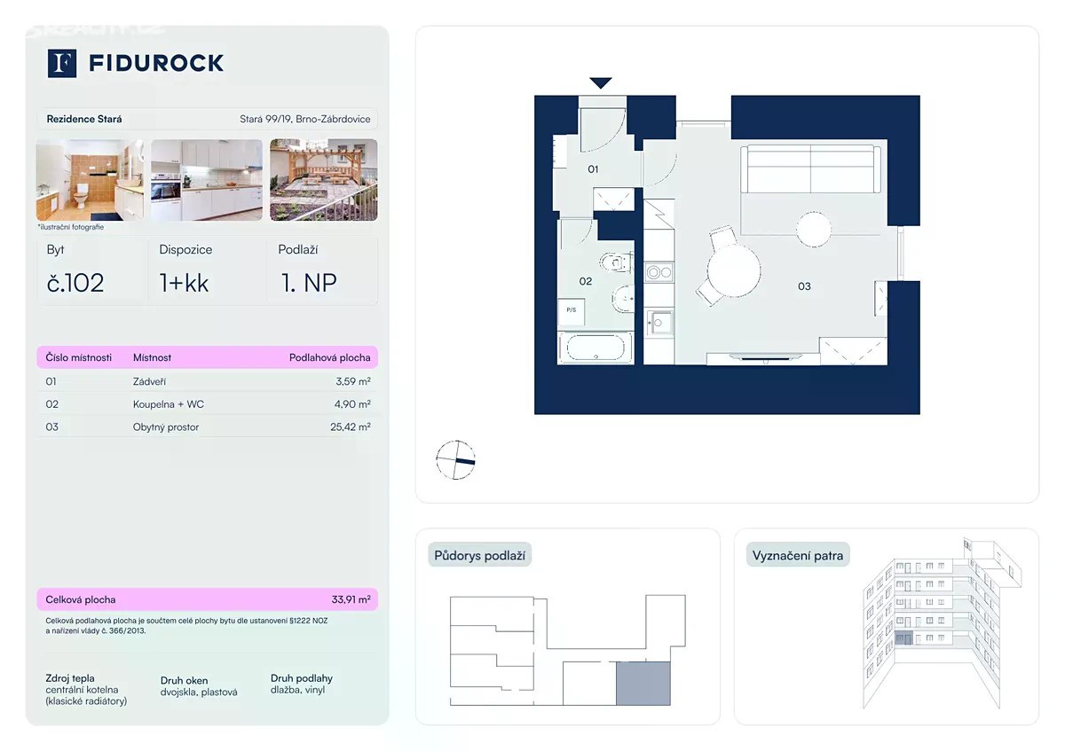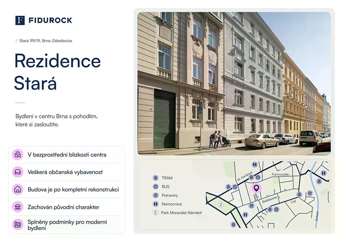 Nabízíme k prodeji krásný, světlý byt 1+kk o velikosti 35,10 m², nacházející se v 1. nadzemním podlaží zrekonstruovaného domu na ulici Stará 19, Brno - střed. Dům má příjemnou pavlačovou architekturu s historickým nádechem, která v sobě spojuje kouzlo starého Brna a komfort moderního bydlení. Informace o bytě: Dispozice: 1+kk Podlahová plocha: 35,10 m² Podlaží: 1. NP (byt č. 102) Cena: 4 150 575 Kč Bez provize! Dispozice bytu - předsíň - koupelna s toaletou - obývací pokoj s plně vybavenou kuchyní (lednice s mrazákem, myčka, varná deska, trouba, digestoř) Podlahy tvoří vinyl a dlažba, byt je po kompletní rekonstrukci. V domě je výtah, parkování možné před domem. V domě nabízíme také více bytů - rádi vám e-mailem zašleme odkaz na karty bytů a kompletní ceník. Všechny byty jsou obsazené ověřenými a platícími nájemníky, což představuje skvělou investiční příležitost bez nutnosti složitého hledání vhodného nájemníka. Lokalita - Stará ulice, Brno-střed Jedna z nejžádanějších adres v centru Brna - klidná ulice Stará se nachází jen pár minut chůze od náměstí Svobody, hlavního nádraží, nebo OC Vaňkovka. V bezprostředním okolí najdete restaurace, kavárny, obchody, lékárnu, poštu i MHD. Díky své poloze je byt ideální jak pro vlastní bydlení v srdci Brna, tak jako investiční příležitost. Máte zájem o prohlídku? Kontaktujte nás e-mailem - rádi Vám poskytneme více informací nebo zašleme půdorys bytu.