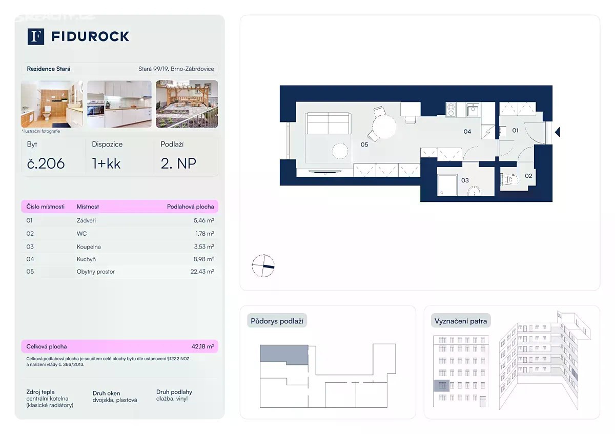 Nabízíme k prodeji krásný, světlý byt 1+kk o velikosti 45,40 m², nacházející se v 2. nadzemním podlaží zrekonstruovaného domu na ulici Stará 19, Brno - střed. Dům má příjemnou pavlačovou architekturu s historickým nádechem, která v sobě spojuje kouzlo starého Brna a komfort moderního bydlení. Informace o bytě: Dispozice: 1+kk Podlahová plocha: 45,40 m² Podlaží: 2. NP (byt č. 206) Cena: 5 222 135 Kč Bez provize! Dispozice bytu - předsíň - toaleta - koupelna - plně vybavená kuchyň (lednice s mrazákem, myčka, varná deska, trouba, digestoř) - obytný pokoj Podlahy tvoří vinyl a dlažba, byt je po kompletní rekonstrukci. V domě je výtah, parkování možné před domem. V domě nabízíme více bytů - rádi vám e-mailem zašleme odkaz na karty bytů a kompletní ceník. Všechny byty jsou obsazené ověřenými a platícími nájemníky, což představuje skvělou investiční příležitost bez nutnosti složitého hledání vhodného nájemníka. Lokalita - Stará ulice, Brno-střed Jedna z nejžádanějších adres v centru Brna - klidná ulice Stará se nachází jen pár minut chůze od náměstí Svobody, hlavního nádraží, nebo OC Vaňkovka. V bezprostředním okolí najdete restaurace, kavárny, obchody, lékárnu, poštu i MHD. Díky své poloze je byt ideální jak pro vlastní bydlení v srdci Brna, tak jako investiční příležitost. Máte zájem o prohlídku? Kontaktujte nás e-mailem - rádi Vám poskytneme více informací nebo zašleme půdorys bytu.