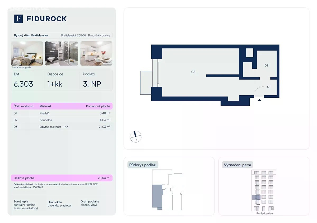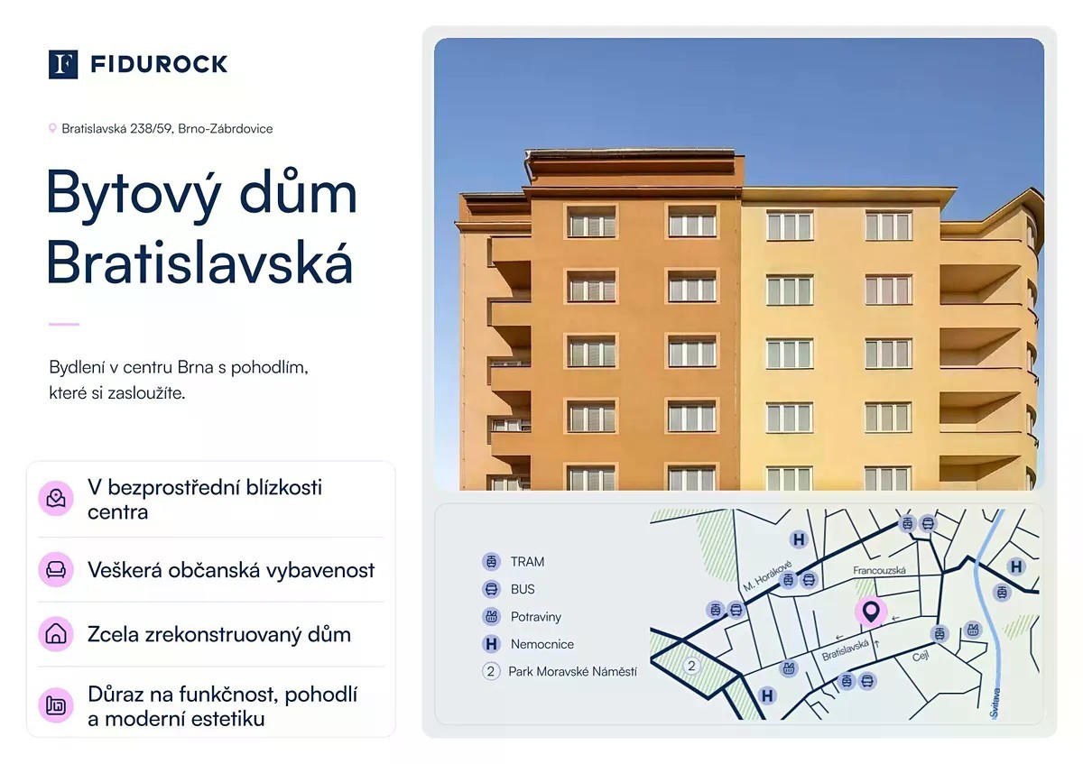 Nabízíme k prodeji krásný, světlý byt 1+kk o velikosti 31,60 m², nacházející se v 3. nadzemním podlaží zrekonstruovaného domu na ulici Bratislavská 59, Brno - střed. Informace o bytě: Dispozice: 1+kk Podlahová plocha: 31,60 m² Podlaží: 3. NP (byt č. 303) Cena: 4 076 400 Kč + 109 650 Kč (sklep) Bez provize! Dispozice bytu - předsíň - koupelna s toaletou - obytný pokoj s plně vybavenou kuchyní (lednice s mrazákem, myčka, varná deska, trouba, digestoř) Podlahy tvoří vinyl a dlažba, byt je po kompletní rekonstrukci. V domě je výtah, parkování možné před domem. V domě nabízíme více bytů - rádi vám e-mailem zašleme odkaz na karty bytů a kompletní ceník. Všechny byty jsou obsazené ověřenými a platícími nájemníky, což představuje skvělou investiční příležitost bez nutnosti složitého hledání vhodného nájemníka. Lokalita - Bratislavská ulice, Brno-střed Bratislavská ulice se nachází v městské části Brno-střed, konkrétně v oblasti Zábrdovice. Tato lokalita je vzdálená přibližně 1 km od centra městské části Brno-střed, což znamená přibližně 15 minut chůze do náměstí Svobody. V okolí ulice Bratislavská se nachází různé obchody, restaurace, kavárny a další služby, které jsou dostupné pěšky nebo krátkou jízdou MHD. Díky své poloze je byt ideální jak pro vlastní bydlení v srdci Brna, tak jako investiční příležitost. Máte zájem o prohlídku? Kontaktujte nás e-mailem - rádi Vám poskytneme více informací nebo zašleme půdorys bytu.