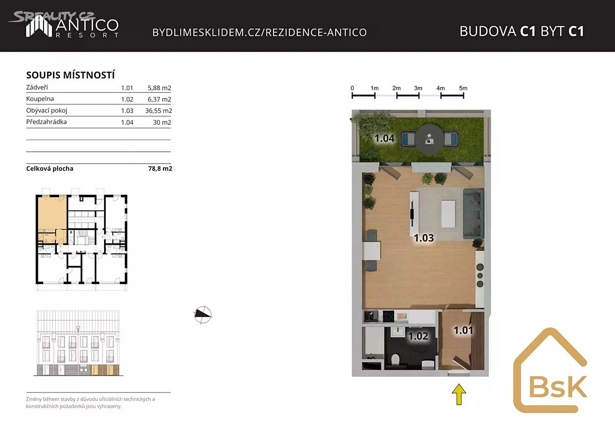 Nabízíme k prodeji moderní a prostorný byt 1+kk o ploše 78,8m², který se nachází v 1. patře moderního projektu Resort Antico v Českém Brodě s výbornou dostupností do centra města. Tento byt vyniká kvalitními materiály a pečlivým provedením garantujícím komfortní bydlení pro jednotlivce či páry. Byt je chytře dispozičně řešený. Po vstupu do bytu vás přivítá zádveří o velikosti 5,88 m², které poskytuje dostatek prostoru pro úložné skříně a pohodlný přístup do dalších částí bytu. Koupelna o výměře 6,37m² je vybavena moderními zařizovacími předměty a nabízí ideální místo pro relaxaci po náročném dni. Hlavní obytná místnost s kuchyňským koutem o velikosti 36,55 m² a přímým vstupem na předzahrádku o velikosti 30 m² je světlá a vzdušná, což vytváří příjemnou atmosféru pro bydlení. Projekt Resort Antico vychází z historie místa, kde se dříve nacházel známý truhlářský areál „Antico“. V současnosti zde vzniká rezidenční zástavba citlivě navazující na okolní rodinné domy s dobrou dostupností do centra města. Skládá se ze 6 bytových a 2 vilových domů se 143 bytovými jednotkami různých velikostí a dispozic nabízející široký výběr podle Vašich potřeb. Byty jsou navrženy tak, aby maximálně využívaly prostor a poskytovaly příjemné a moderní prostředí pro život. Otevřený koncept obývacího prostoru s kuchyňským koutem vytváří příjemnou atmosféru. Každá jednotka je vybavena moderními spotřebiči a kvalitními materiály zajišťující dlouhou životnost a vysoký standard bydlení. Velká okna pak poskytnou dostatek přirozeného denního světla. Ke každému bytu nabízíme možnost přikoupit sklepní prostor, podzemní garážové stání, venkovní stání či místo v parkovacím zakladači, kde pohodlně zaparkujete i s SUV. Informace o standardech, umístění jednotky, lokalitě, dopravní dostupnosti do okolních měst včetně Prahy, nabídce služeb či volnočasových aktivit najdete na našich webových stránkách. Odkaz na tyto stránky naleznete níže u developerského projektu Resortu Antico umístěného níže nad kontaktem makléře. Rádi Vám zajistíme financování koupě na míru a komplexně se postaráme o prodej stávající nemovitosti v případě, že budete kupní cenu hradit částečně či zcela úplně právě z prodeje. Přijďte se přesvědčit o kvalitách tohoto jedinečného projektu a objevte svůj nový domov. Těšíme se na Vás na prohlídkách.