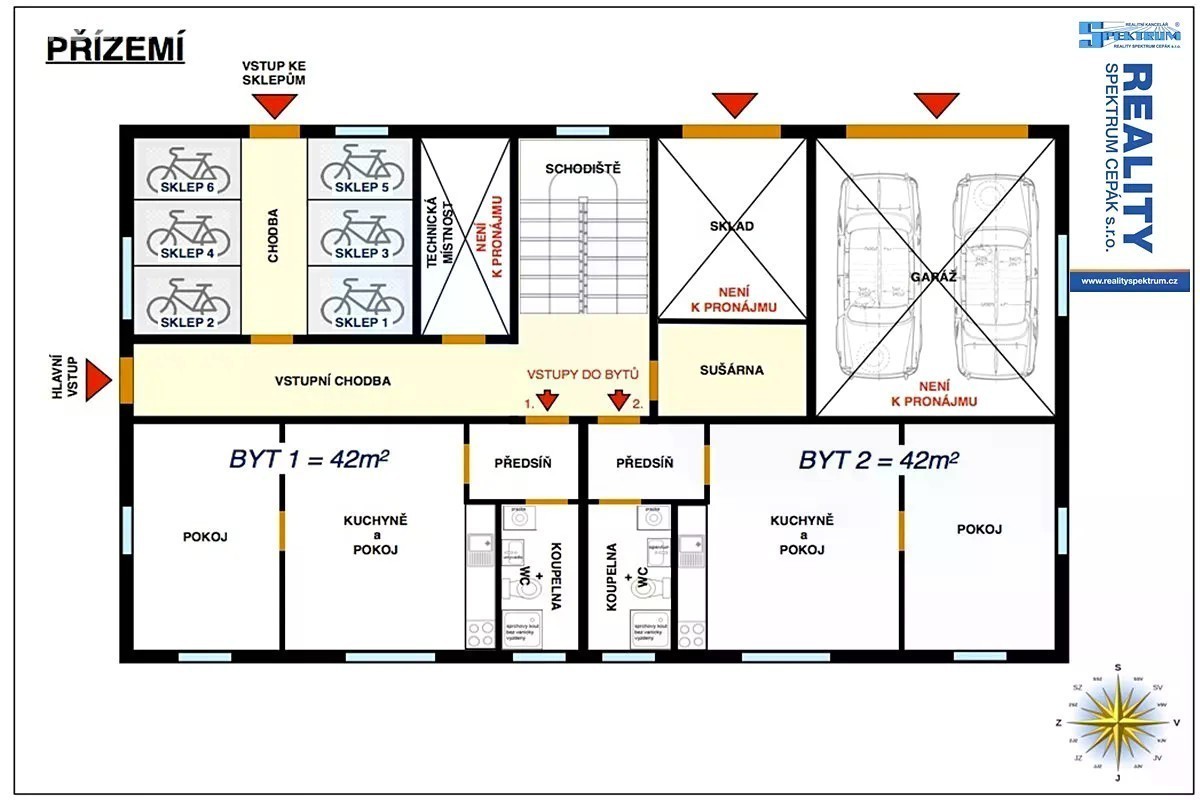 Pronájem velmi příjemného bytu o velikosti 2+kk nacházejícího se v přízemí menšího bytového domu v centru obce. Výměra bytu je 42m2. Byt se nachází v přízemí bez jediného schodu. Proto je vhodný i pro osoby se sníženou pohyblivostí. K vybavení bytu patří kompletní kuchyňská linka (varná deska, trouba, myčka nádobí a lednice s mrazákem). Koupelna se sprchovým koutem, WC a pračkou. K bytu náleží uzavřená koje vlastní parkovací místo na uzavřeném pozemku. Všechny energie jsou samostatně měřené. K dispozici je stálé připojení k internetu a TV (součástí nájmu). Nájemníkům je k dispozici vnitřní sušárna, venkovní sušák na prádlo, kryté venkovní posezení a garáž pro motocykly a kola. - Nájemné: 11.800,- Kč/měs. + energie (zálohy 3.200,- Kč/měs.). - Kauce: 24.000,- Kč. - Bez provize!