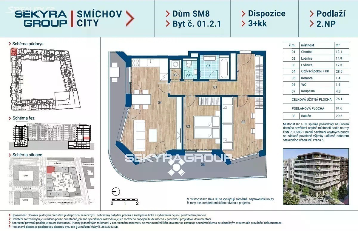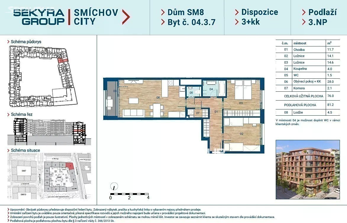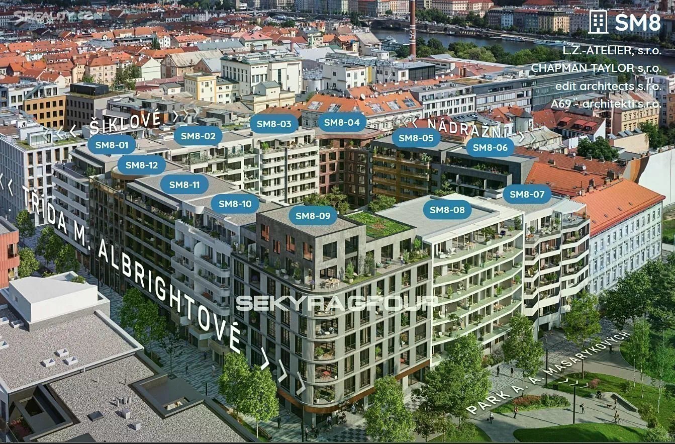 Dovolujeme si Vám nabídnout k prodeji byt 3+kk o výměře 82,4 m² s balkónem 12,8 m² v rezidenčním projektu Smíchov City, blok SM8. K bytu je možné přikoupit 1 parkovací stání. V ceně bytu je podlahové topení, předokenní žaluzie a příprava na dochlazování. SM8 navazuje na již realizované rezidenční bloky SM1/2 a SM3 a zahrnuje celkem 12 bytových domů. Je součástí projektu Smíchov City, jehož záměrem je nabídnout obyvatelům moderní bydlení s vysokým standardem provedení, vybavené špičkovými technologiemi. Nespornou výhodou je navíc umístění v centru města. Exkluzivní byty doplní v přízemí objektů funkční městský parter s obchody a službami. V ulicích budou vysázeny stromy, které zpříjemní klima a v horkých dnech poskytnou chladivý stín. Blok sousedí s třídou Madeleine Albrightové pojatou jako pěší podélný park a budoucím parkem Alice a Anny Masarykových. Byty v bloku SM8 jsou navrženy tak, aby si podle svých preferencí a možností mohl vybrat opravdu každý. Dispozičně tu naleznete vše - od malých bytů 1+kk až po velké byty kategorie 5+kk s nádhernými výhledy na Prahu. Samozřejmostí je dostatek parkovacích míst, technické zázemí a sklepní kóje v suterénu objektu. V posledním podlaží jsou pak ty nejexkluzivnější byty, z nichž některé nabízí jedinečný pohled na Vyšehrad. Všechny byty jsou navrženy ve vysokém standardu, což se týká povrchových materiálů i zařízení, jako je podlahové topení či vzduchotechnika s rekuperací vzduchu. Standard bytů lze samozřejmě přizpůsobit potřebám budoucích majitelů. Stačí se obrátit na naše prodejce.