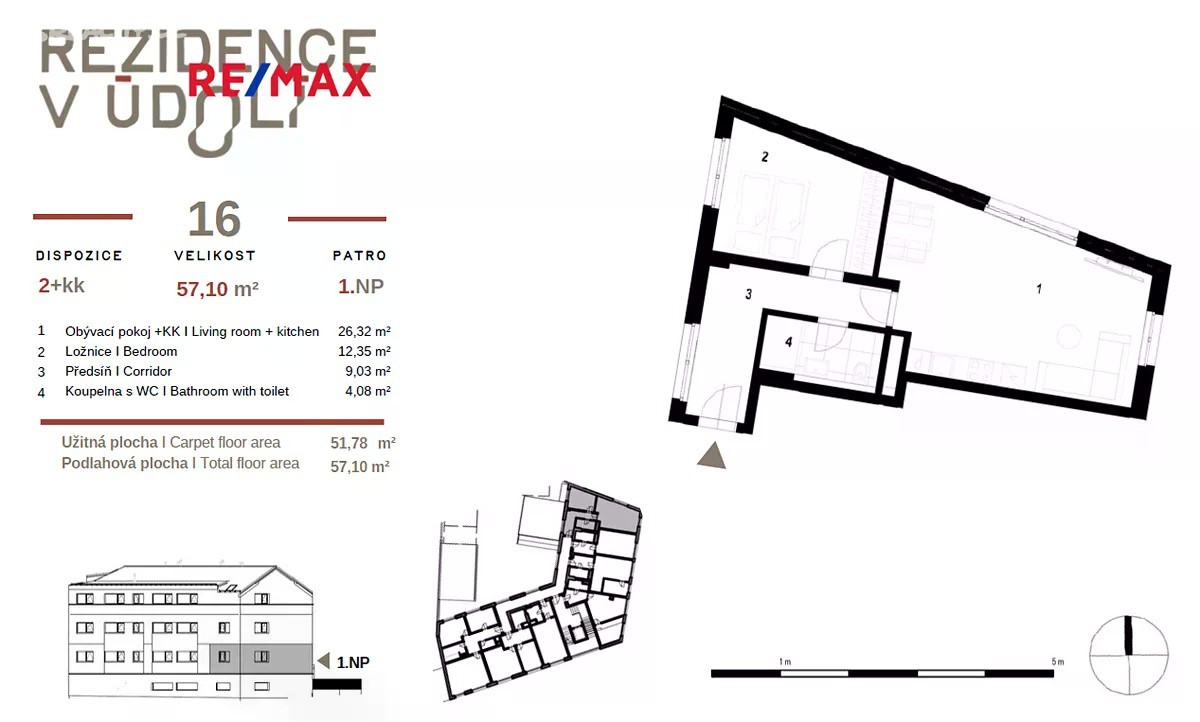 Exkluzivně nabízíme k prodeji moderní byt 2+kk o velikosti 57,1 m² v projektu Rezidence V Údolí, který spojuje komfort městského bydlení s klidem a zelení Hrdlořez. Součástí prodeje je parkovací stání (zakladač) ve vnitrobloku a sklepní kóje. Byt zaujme svou promyšlenou dispozicí a nadčasovým designem. Dominantou prostoru je světlý obývací pokoj s kuchyňským koutem, který je orientován do tichého vnitrobloku - ideální prostředí pro odpočinek po náročném dni. Ložnice je příjemně oddělena a nabízí dostatek soukromí. Koupelna působí elegantně díky velkoformátové dlažbě a moderní sanitě, samozřejmostí je příprava na pračku. Byt se nachází v 1. patře novostavby a díky své orientaci poskytuje dostatek denního světla a pocit klidu. Kvalitní standard zahrnuje velkoformátová okna s trojskly, otopná tělesa s termostatickou hlavicí a precizně zpracované povrchy, které zaručují pohodlí i nízké provozní náklady. Lokalita Praha 9 - Hrdlořezy patří mezi vyhledávané pražské čtvrti. Nabízí klidné bydlení obklopené zelení, cyklostezku podél Rokytky a přitom rychlé spojení do centra města. V okolí nechybí obchody, restaurace, školy ani sportoviště. Tento byt představuje skvělou volbu pro vlastní bydlení i jako bezpečnou investici v rostoucí lokalitě s velkým potenciálem.