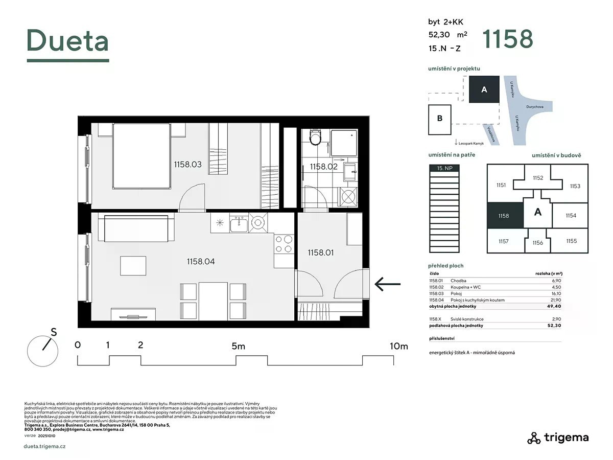 Byt č. 1154: Světlé 2+kk orientované na východ Výstavba zahájena - 40 % bytů prodáno během 6 měsíců! Neváhejte s výběrem - právě teď máte možnost zvolit si ideální dispozici i orientaci bytu v atraktivním projektu Dueta Kamýk, který spojuje moderní bydlení s přírodou Byt č. 1154 o dispozici 2+kk a podlahové ploše 53,30 m² je situován ve 15. nadzemním podlaží s orientací na východ, což zajišťuje ranní světlo a příjemnou atmosféru. Dispozice bytu zahrnuje prostorný obývací pokoj s kuchyňským koutem (24,50 m²), ložnici, koupelnu s WC a chodbu. Obytná plocha činí 49,90 m², doplněná o konstrukční prvky. · Východní orientace zajišťuje přirozené ranní světlo · Kompaktní dispozice s efektivním využitím prostoru · Energetická třída A - mimořádně úsporná Vhodné pro: Páry nebo jednotlivce, kteří hledají moderní byt s příjemnou atmosférou a efektivním řešením. Projekt Dueta Kamýk přináší jedinečnou kombinaci klidného bydlení uprostřed přírody a skvělé dostupnosti do centra Prahy díky plánované trase metra D. Lokalita nabízí nejen blízkost lesoparku a rozsáhlé zeleně, ale i atraktivní výhledy, které ocení každý milovník přírody. Byty jsou vybaveny nadstandardními technologiemi - rekuperací, podlahovým vytápěním, předokenními žaluziemi a kvalitními materiály, které zaručují pohodlí i úsporný provoz. Dueta Kamýk je ideálním řešením jak pro vlastní bydlení, tak jako chytrá investice v rychle se rozvíjející lokalitě.