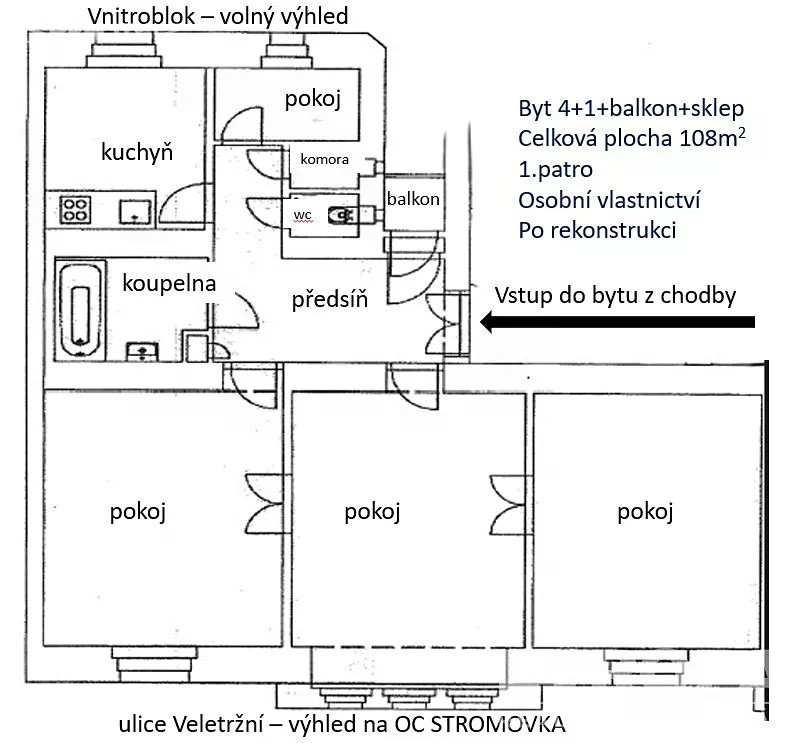 Exkluzivně nabízíme prodej světlého luxusního bytu 4+1 v prvorepublikovém domě ve Veletržní ulici, Praha 7. Nevšední byt o celkové užitné ploše 108 m², situovaný v prvním patře činžovního domu z roku 1945 prošel kompletní nákladnou rekonstrukcí před cca 5ti lety s respektováním historických prvků (dvoukřídlé dveře, dubové parkety,. ) včetně oken, dveří, obložení, podlah, vytápění včetně těles po bytě, koupelny a sanitárního vybavení. Náklady rekonstrukce byly téměř 3miliony Kč. Byt se prodává včetně vybaveníviz. foto. Koncepce bytu je ideální z prostorné haly vcházíte do téměř všech místností (3 pokoje, koupelna, kuchyň, WC, technická, balkon) byt by umožňoval i vícegenerační bydlení. Byt kromě prostorné haly tvoří 3 velké a 1 malý pokoj, samostatná kompletně vybavená prostorná kuchyň s moderními spotřebiči, koupelna s vanou, sprchovým koutem a novým kotlem, samostatné WC, samostatnou komoru a malý balkon. K bytu náleží i prostorný sklep. Byt má část oken do ulice a část do dvora, je perfektně větratelný a světlý. Parkování pro rezidenty Prahy 7 je umožněno v OC Stromovka za zvýhodněných podmínek. Celkově byt spojuje historický charakter s moderním pohodlím díky podpoře architektů má tento byt zachovány původní prvky, které v kombinaci s vysokými stropy a šetrně volenými moderními spotřebiči vytváří místo, které může být i Vaším DOMOVEM. Mezi bonusy bytu určitě patří balkón a sklep, investiční příležitostí může být podíl na zastavěné ploše vnitrobloku. Díky poloze je byt ideální pro ty, kdo ocení bydlení v centru dění s výbornou dostupností do kterékoli části Prahy. Byt se nachází ve vyhledávané lokalitě Holešovic přímo proti OC STROMOVKA, místo je známé svým bohatým sportovním, kulturním a společenským životem. V blízkém okolí naleznete množství restaurací, kaváren, galerií a obchodů, výstavišť, parků (Stromovka, Letná). Tato oblast je také skvěle dopravně dostupná, včetně rychlého spojení do jiných částí Prahy. Parkování v případě zájmu lze vyřešit dlouhodobým pronájmem v domě přes ulici. Komfort obyvatel v domě zvyšuje výtah, v domě je pouhých 14 jednotek a bezkonfliktní SVJ. Byt má navzdory velikosti nízké měsíční náklady. Nemovitost není zatížena žádným břemenem a lze ji financovat hypotékou, což dělá tuto nabídku přístupnější širší skupině zájemců. Pokud hledáte bydlení spojující historii, současnost a luxus v jedinečné lokalitě, tento byt je přesně pro Vás. Navštivte tento exkluzivní domov a nechte se okouzlit atmosférou, která zde panuje. Těšíme se na vaši návštěvu a jsme připraveni zodpovědět jakékoliv další dotazy ohledně této mimořádné nemovitosti.