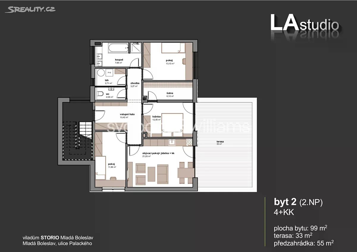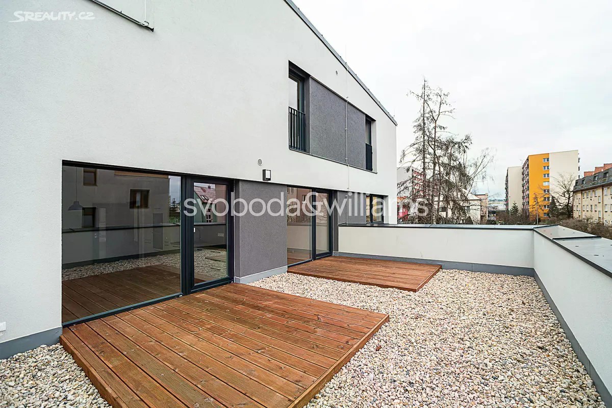 Slunný rodinný byt s velkou terasou a soukromou předzahrádkou zaujímá celé 2. podlaží moderního nízkoenergetického viladomu s pouhými 3 bytovými jednotkami. Dům stojí v tichém vnitrobloku rezidenční zástavby přibližně 5 minut chůze od galerie Bondy a v rychlém dosahu historického centra Mladé Boleslavi. Plochu bytové jednotky tvoří obývací pokoj s jídelním koutem přímo propojený se západně orientovanou terasou o výměře 33 m2, hlavní ložnice se šatnou a 2 další ložnice. Ze vstupní haly s úložnými prostory je přístupná koupelna s vanou i sprchovým koutem, samostatná toaleta a technická místnost. Standard bytu kolaudovaného v roce 2020 zahrnuje velkoformátová okna, velkoformátové podlahy v dekoru dub, kuchyňskou linku na míru, vestavěné spotřebiče Whirpool, nadčasovou koupelnu SIKO a podlahové topení. Vytápění je řešeno vlastním plynovým kotlem. Lokalita zavedené rezidenční čtvrti s výbornou dostupností občanské vybavenosti - v docházkové vzdálenosti jsou mateřské a základní školy, dětská hřiště, obchody, kavárny, restaurace i velký sportovní areál. Nákupní galerie Bondy a autobusové nádraží je vzdálené 5 minut chůze, stejně tak Klaudiánova nemocnice. Centrum města je dostupné pěšky nebo autobusem z ulice Havlíčkova. K bytu je možné přikoupit venkovní kryté parkovací místo za 300 000 CZK. Byt je v současné době pronajatý, nájemní smlouva je uzavřena do 4. ledna 2026. Podlahová plocha cca 99 m2, terasa 33 m2, předzahrádka 55 m2. (Přesná výměra bytu bude doplněna po zaměření jednotky.)