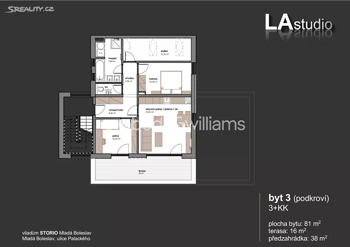 Jižně orientovaný prostorný byt s velkou terasou zaujímá prostory v nejvyšším podlaží komorního viladomu situovaného v klidné rezidenční oblasti jen pár minut chůze od galerie Bondy. K bytu náleží vlastní předzahrádka. Podkrovní třípokojový byt sestává z obývacího pokoje s kuchyňským koutem, 2 ložnic, ateliéru, koupelny s vanou i sprchovým koutem, samostatné toalety a vstupní haly s úložnými prostory. Nechybí jižně orientovaná terasa s krásným výhledem do okolí. Standard bytu kolaudovaného v roce 2020 zahrnuje velkoformátová okna, velkoformátové podlahy v dekoru dub, kuchyňskou linku na míru, vestavěné spotřebiče Whirpool, nadčasovou koupelnu SIKO a podlahové topení. Vytápění je řešeno vlastním plynovým kotlem. Lokalita zavedené rezidenční čtvrti s výbornou dostupností občanské vybavenosti - v docházkové vzdálenosti jsou mateřské a základní školy, dětská hřiště, obchody, kavárny, restaurace i velký sportovní areál. Nákupní galerie Bondy a autobusové nádraží je vzdálené 5 minut chůze, stejně tak Klaudiánova nemocnice. Centrum města je dostupné pěšky nebo autobusem z ulice Havlíčkova. K bytu je možné přikoupit venkovní kryté parkovací místo za 300 000 CZK. Podlahová plocha cca 81 m2, terasa 16 m2, předzahrádka 38 m2. (Přesná výměra bytu bude doplněna po zaměření jednotky.)