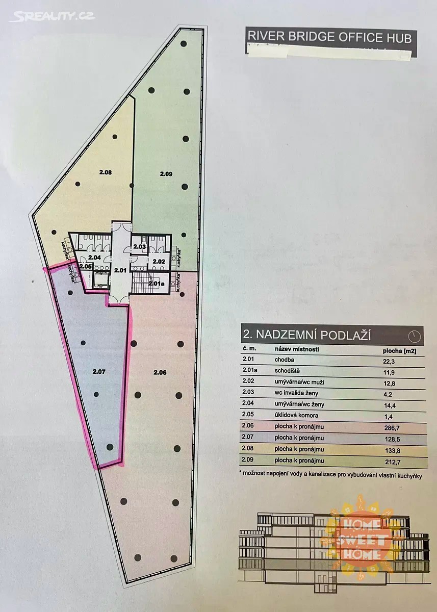 Zcela nové kancelářské prostory k pronájmu 128,5m2 se nachází ve 2.NP moderní administrativní budovy s krásným výhledem na řeku v ulici Strakonická, Praha 5, Hlubočepy. Prostory (ozn. 2.07) mají speciální zvýhodněné nájemné po dobu prvních tří měsíců. Jedná se o prostornou kancelář, na patře je možnost napojení vody a kanalizace pro vybudování vlastní kuchyňky, úklidová komora, umývárny a toalety pro ženy a muže (1xbezbariérový přístup). Budova má non-stop recepci a ostrahu. Možnost pronájmu parkování za poplatek: krytá parkovací stání pod budovou 115 € /měsíc, venkovní parkovací stání 85 € /měsíc, parkovací stání za mostem 1010Kč/měsíc. Jedná se o novou šesti patrovou administrativní budovu na břehu řekly Vltavy, která se stane součástí areálu River Business Centre v místech původní budovy inSPORTline. Tento unikátní projekt nabízí moderní a inspirativní pracovní prostředí v blízkosti Dvoreckého mostu, který v dohledné době propojí oba břehy řeky Vltavy a zjednoduší tak dostupnost celého areálu.Dopravní dostupnost - 2 minuty na stanici autobusů a tramvají. Možnost pronájmu celého 2.NP o rozloze cca 760m2. Cena je náběhová (první 3. měsíce) poté bude navýšena na 13,9 € za metr + poplatky + DPH.