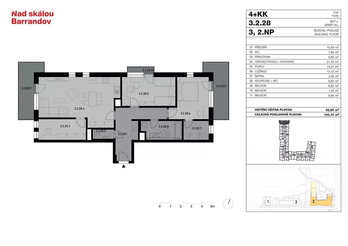 Prostorný byt 4+kk, 100,10 m² + 3x balkon - Praha 5, Barrandov Nabízíme ke koupi moderní byt o dispozici 4+kk o podlahové ploše 100,10 m², který se nachází v 2. nadzemním podlaží rezidenčního projektu v lokalitě Prahy 5 - Barrandov. Byt je situován na 3 světové strany (východ, sever a západ). Celý projekt je navržen v duchu současné architektury s důrazem na kvalitní materiály, energetickou efektivitu a komfortní bydlení. Plánované nastěhování: 1Q 2028 K bytu je možné přikoupit sklepní kóji a až 2 garážová stání. Součástí prodeje je zajištění kompletního realitního a právního servisu včetně individuálního přístupu a koordinace celého procesu koupě. V případě zájmu o více informací či sjednání osobní schůzky nás neváhejte kontaktovat. Rádi vám poskytneme veškerou dokumentaci a odpovíme na vaše dotazy.