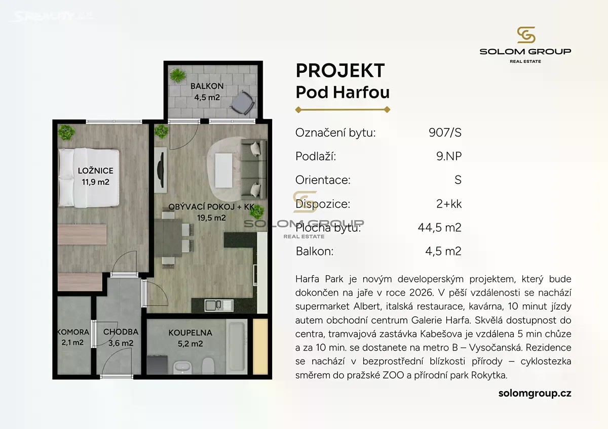 Prodej nového bytu 2+kk o velikosti 44,5 m² + lodžie 4,5 m², který se nachází v 9. patře cihlové novostavby v rezidenci Harfa Park (dům S). Jelikož se jedná o družstevní byt, neprokazujete výši příjmu, nepotřebujete hypoteční úvěr a cenu bytu splácíte formou splátek v měsíčních poplatcích („měsíční splátka anuity“) Splácet začínáte až po kolaudaci domu, do té doby nic neplatíte. Byt Vám je předán hotový vč. zařízené koupelny (umyvadlo, vana, topný žebřík a závěsné WC) dále interiérové dveře, plastová okna, nové rozvody vody, elektřiny a odpadů, příprava pro kuchyňskou linku, obklady a dlažba. Je možno také využít dotaci na výběr podlahové krytiny ve výši 500 Kč/m2. V okolí je kompletní občanská vybavenost - supermarket Albert, restaurace, kavárna, 10 min. autem obchodní centrum Galerie Harfa. Skvělá dostupnost do centra, TRAM zast. Kabešova 5 min chůze nebo 10 min. metro B - Vysočanská. Rezidence se nachází v bezprostřední blízkosti přírody - cyklostezka směrem do pražské ZOO, přírodní park Rokytka. Akontace za byt vč. sklepní kóje: 3.400.000,- Kč Akontace za garážové stání: 150.000,- Kč Anuita k bytu: 4.783.099,- Kč Anuita ke garážovému stání: 400.000,- Kč Anuita ke sklepní kóji: 125.535,- Kč Možnost vložení mimořádné splátky či doplacení celé výše anuity a převedení bytu do osobního vlastnictví. Předpokládaný termín kolaudace domu - jaro 2026.