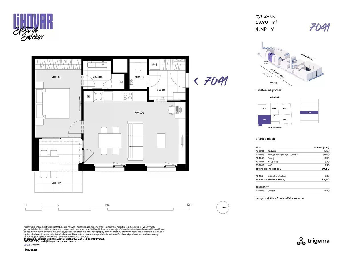 Staňte se součástí výjimečného projektu! Smíchov se mění - a vy můžete být u toho. Třetí a zároveň poslední etapa výjimečného projektu uzavírá vznik nové čtvrti, kde se industriální styl snoubí s moderní architekturou. Na místě vyroste živý prostor plný obchodů, služeb a kulinářských zážitků v rámci rozsáhlého food courtu. Nový Dvorecký most propojí Smíchov s Podolím a rekonstrukce Smíchovského nádraží dodá celé lokalitě ještě větší hodnotu. Prémiové byty ve vyšších patrech nabídnou neopakovatelné výhledy na Vltavu, Vyšehrad a Pankrác. Poslední šance stát se součástí místa, které definuje budoucnost této části Prahy. Komfortní 2+kk s lodžií a promyšlenou dispozicí Byt č. 7042 o dispozici 2+kk s podlahovou plochou 58,60 m² se nachází ve 4. nadzemním podlaží a je orientovaný na západ. · Velkorysý obývací prostor s přímým vstupem na lodžii · Oddělené WC a koupelna pro větší komfort · Praktické zádveří a úložný potenciál v chodbě · Energetická třída A - mimořádně úsporná O pohodlí se starají moderní technologie - rekuperace, stropní chlazení, exteriérové žaluzie či izolační trojskla. Vše je řízeno chytrým systémem Loxone, který zajišťuje příjemné a úsporné bydlení v každém ročním období. Byty v LIHOVARU jsou navrženy pro maximální komfort a praktičnost. Každý byt má vlastní terasu nebo lodžii. Promyšlené dispozice přinášejí dostatek světla a vzdušnost, přičemž ideální domov tu najde jak náročný singl, tak rodina s dětmi. Fotografie interiéru jsou pouze referenční. Pro prohlídku nemovitosti kontaktujte makléře společnosti. Nabídka dalších bytů na stránkách developerského projektu.