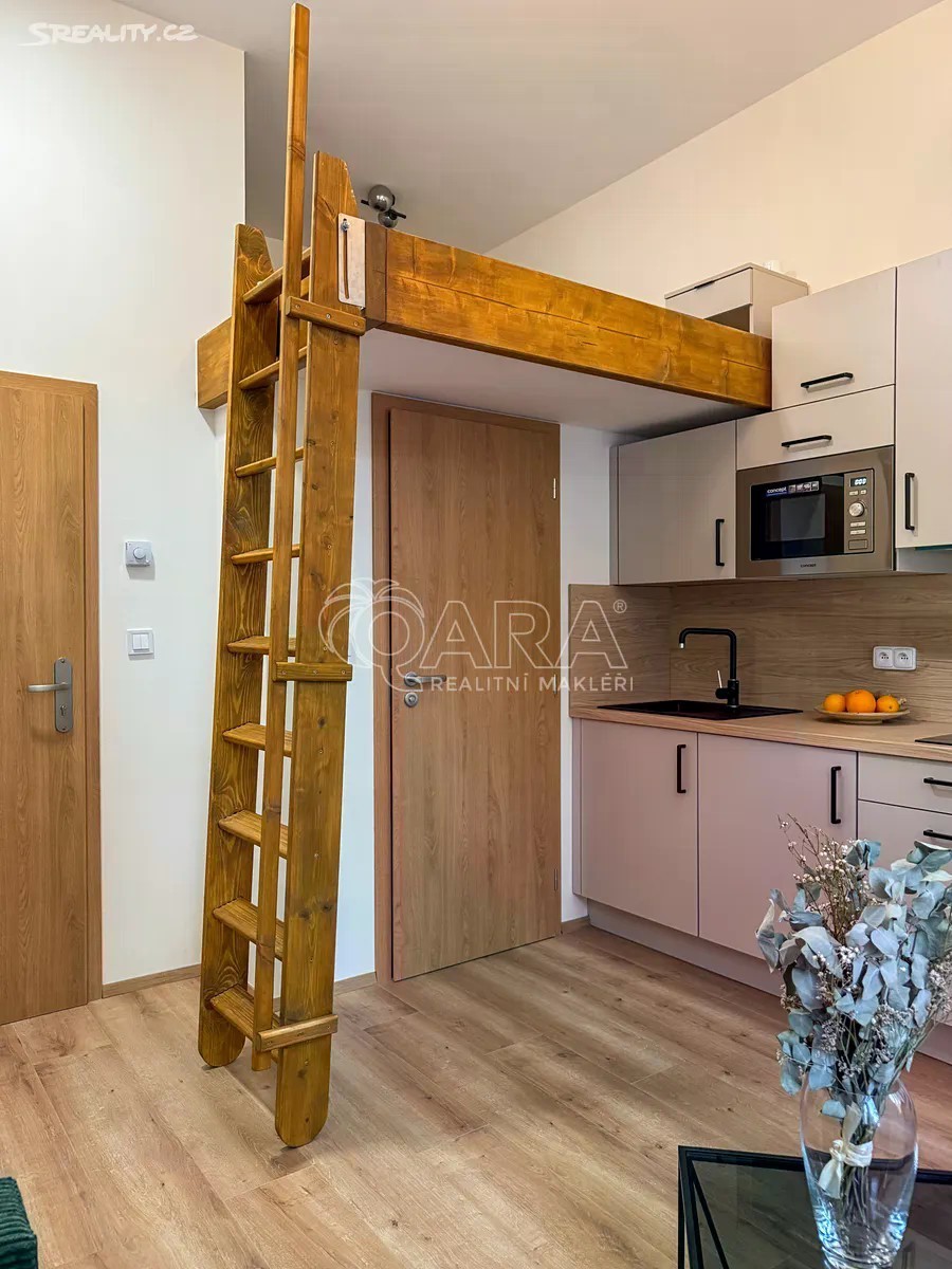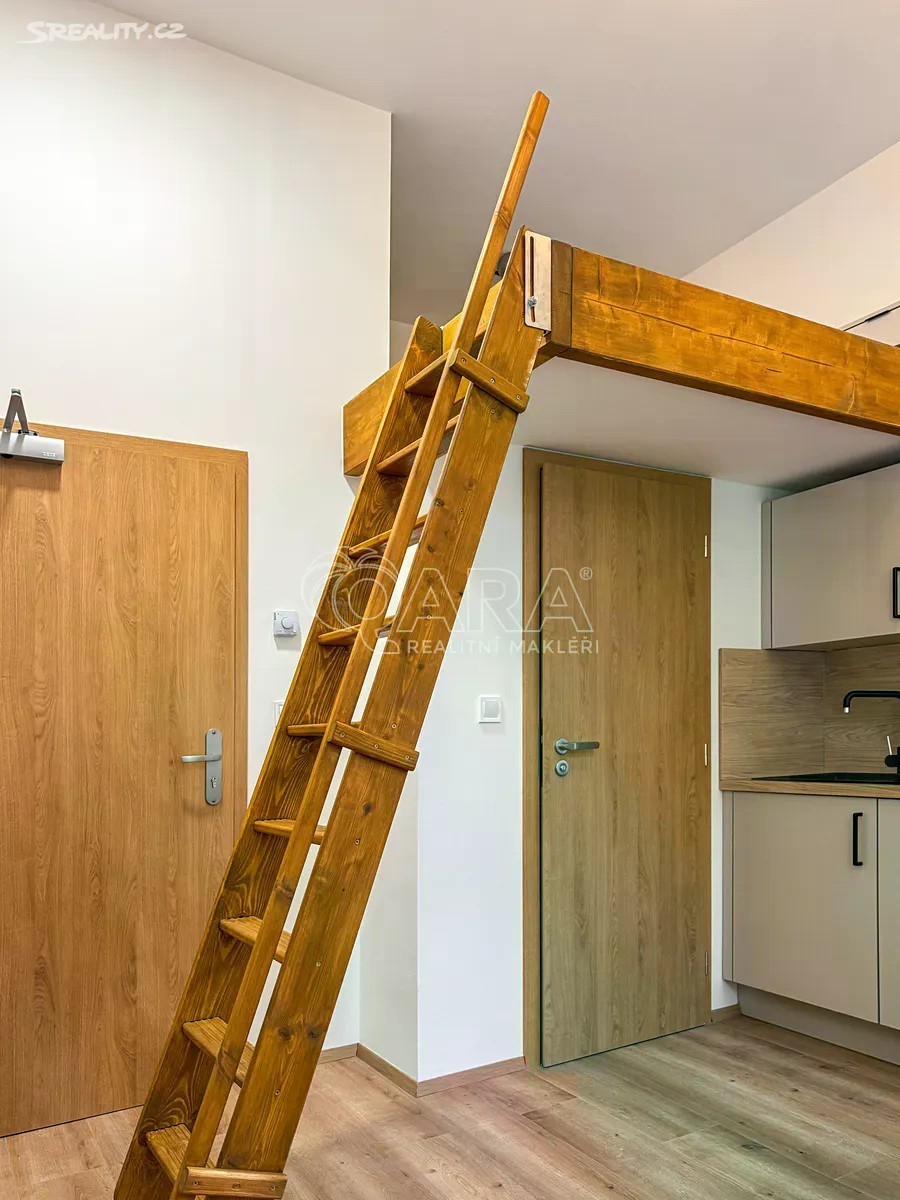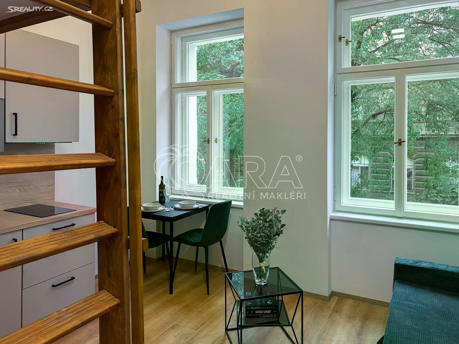 K pronájmu nabízíme elegantní, nově zrekonstruovaný a kompletně zařízený byt/ateliér 1+kk s patrem na spaní v ulici Sokolská, Praha 2 - na opravdu dobré adrese, jen pár minut od I. P. Pavlova. Světlý byt s podlahovou plochu 17,1 m² se nachází ve 2. patře udržovaného domu s recepcí a výtahem. Dispozice je řešená velmi chytře: dole je obytná část s kuchyní (13,1 m²) a nahoře pohodlné patro na spaní o velikosti cca 5 m², díky čemuž působí byt větším a hlavně praktickým dojmem. Byt je zařízen kuchyňskou linkou, jídelním stolem se židlemi, pohovkou a šatní skříní se zrcadlem, takže je možné se prakticky ihned nastěhovat. Koupelna s toaletou (3,8 m²) je prostorná v elegantním stylu. K bytu navíc patří i komora na patře o velikosti 1,6 m² s místem na pračku. Lokalita je velkým benefitem. Sokolská, Praha 2 znamená, že jste pár kroků od metra C - I. P. Pavlova, zastávek tramvají a do centra jste za pár minut pěšky. V okolí je spousta kaváren, bister, restaurací, obchodů i služeb, takže se dá fungovat úplně bez auta. Zároveň máte možnost mít v centru malé, ale reprezentativní a elegantní bydlení. Vhodné pro jednotlivce, případně pár. K nastěhování ihned.