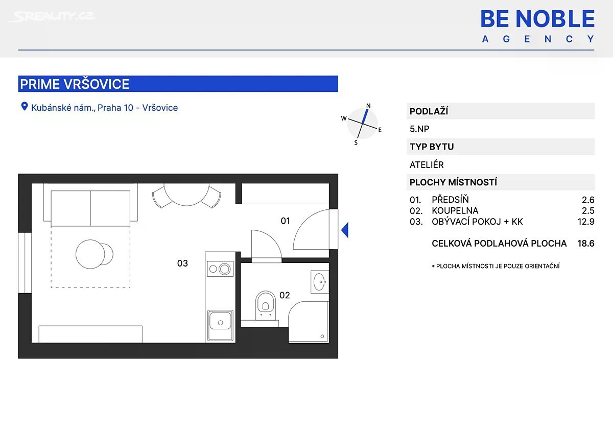 Prodej kompletně zařízeného nového bytu 1+kk se sklepem v Praze 10 - Vršovice Ideální investiční příležitost s čistým výnosem až 4,5 % ročně Nabízíme ke koupi úplně nový, právě dokončený a kompletně vybavený byt 1+kk o velikosti 21,4 m² (18,4 m² celková podlahová plocha + sklep 3 m²), umístěný v 5. patře nového rezidenčního projektu Prime Vršovice na Kubánském náměstí. Byt, který vznikl teprve nedávno, nebyl dosud trvale obýván a představuje výjimečnou kombinaci bezpečné investice a stylového městského bydlení. ⸻ Výnos a investiční potenciál Tento byt je ideální volbou pro investory, kteří hledají stabilní a nadprůměrně výnosnou nemovitost v Praze. Díky své dispozici, lokalitě a plnému vybavení dokáže zajistit čistý výnos až 4,5 % ročně z dlouhodobého pronájmu, což je ve srovnání s běžnými pražskými pronájmy výrazný nadprůměr. Navíc lze koupi financovat hypotečním úvěrem, což dělá tuto nabídku prakticky bezkonkurenční. ⸻ Interiér a vybavení Byt byl navržen tak, aby dokonale využil každý centimetr prostoru a zároveň působil útulně i elegantně. Součástí je moderní kuchyňská linka s dostatkem úložných prostor, varnou deskou, lednicí, mikrovlnnou troubou a vestavěnou digestoří. Obytná část je vybavena kompletním nábytkem, dekorem a osvětlením od společnosti Bonami v celkové hodnotě přes 350 000 Kč - tedy nejen kuchyní, ale i pohovkou, komodou, stolem, závěsy, záclonami a designovými svítidly. Výsledkem je byt, který je připraven k okamžitému užívání nebo pronájmu - bez nutnosti dalších investic. Velké okno orientované do klidného vnitrobloku zajišťuje dostatek světla a příjemný výhled z 5. patra. V koupelně se nachází sprchový kout, toaleta a úložné prostory pod umyvadlem. K bytu náleží prostorný sklep o velikosti 3 m², který je přístupný výtahem. Bezpečnost i komfort zvyšuje domácí videotelefon, vstup na čipy či QR kód a moderní laundry box servis přímo v domě. ⸻ Lokalita Kubánské náměstí je jednou z nejživějších částí Vršovic - oblíbené díky svým farmářským trhům, kavárnám, restauracím i blízkým parkům. Okolí nabízí nejen pestrý společenský život, ale i vynikající dopravní dostupnost - tramvajová zastávka je přímo před domem, linka 22 vás doveze za 13 minut na Náměstí Míru a za 20 minut na Národní třídu. Jedná se o již velmi rozvinutou lokalitu, která však má velkou perspektivu pro další nárůst hodnoty. Metro A (Strašnická) je vzdáleno pouhé 3 minuty jízdy nebo 10 minut chůze. V blízkosti se nachází také nákupní centrum Eden, sportovní areály (Slavia, Gutovka, tenisové kurty, sportovní haly) i rozsáhlé zelené plochy pro relaxaci. ⸻ Shrnutí • Nový byt 1+kk (18,4 m²) + sklep (3 m²) • Kompletní vybavení v hodnotě 350 000 Kč • Prémiový interiér od Bonami, odlišný od 99 % nabídek • Nový rezidenční projekt Prime Vršovice - bez starostí s údržbou • Velmi nízké měsíční náklady • Stabilní čistý výnos až 4,5 % ročně • Byt je v katastru veden jako ateliér, avšak nemá z praktického hlediska omezení bránící trvalému užívání a je možné ho financovat hypotečním úvěrem. • Vynikající dopravní dostupnost a atraktivní městská čtvrť ⸻ Byt je volný ihned k převzetí, vhodný jak pro investora, tak pro jednotlivce či pár hledající komfortní startovací bydlení bez nutnosti dalších nákladů. S financováním rádi pomůžeme. Takto dokončených jednotek máme pouze několik a rychle mizí - doporučujeme osobní prohlídku. Be Noble agency