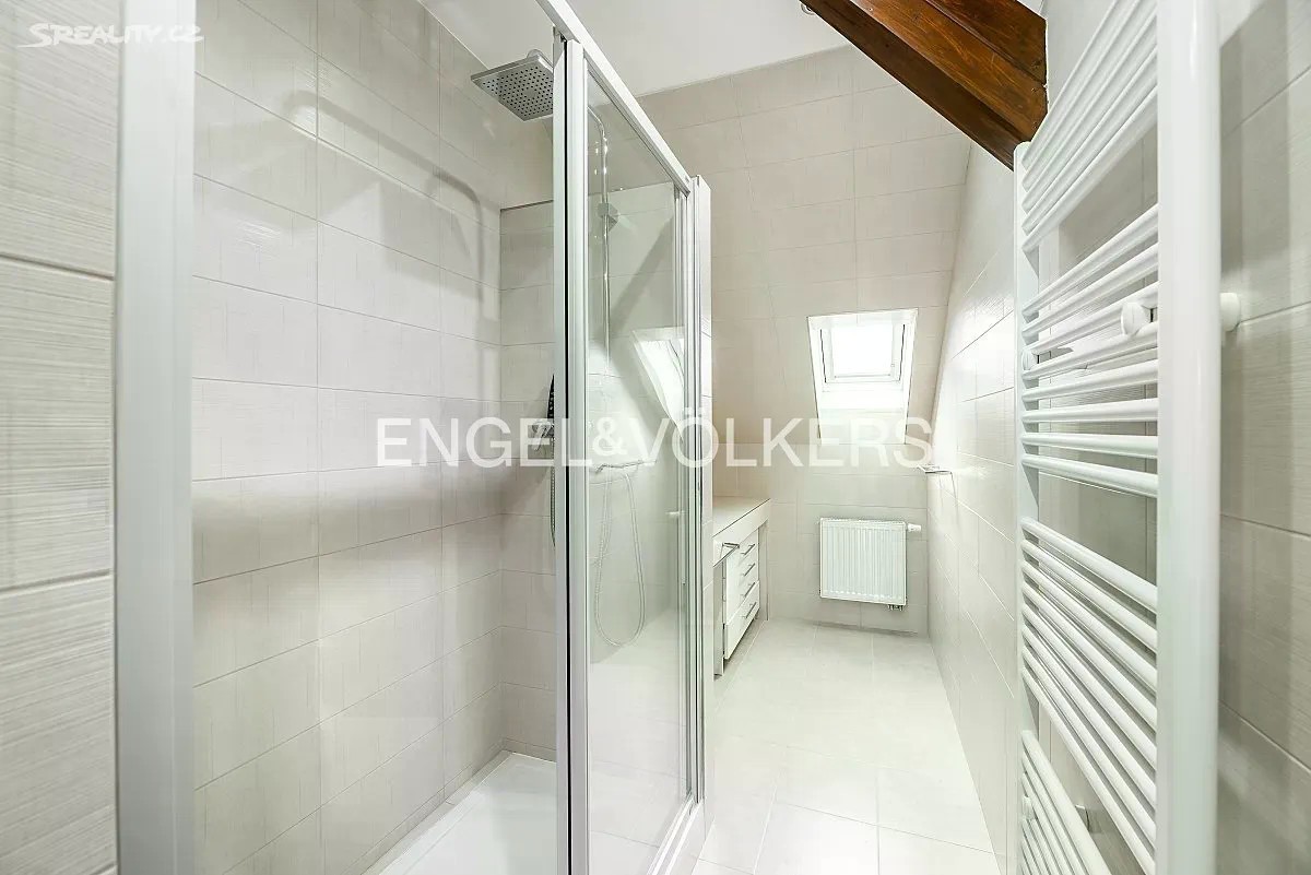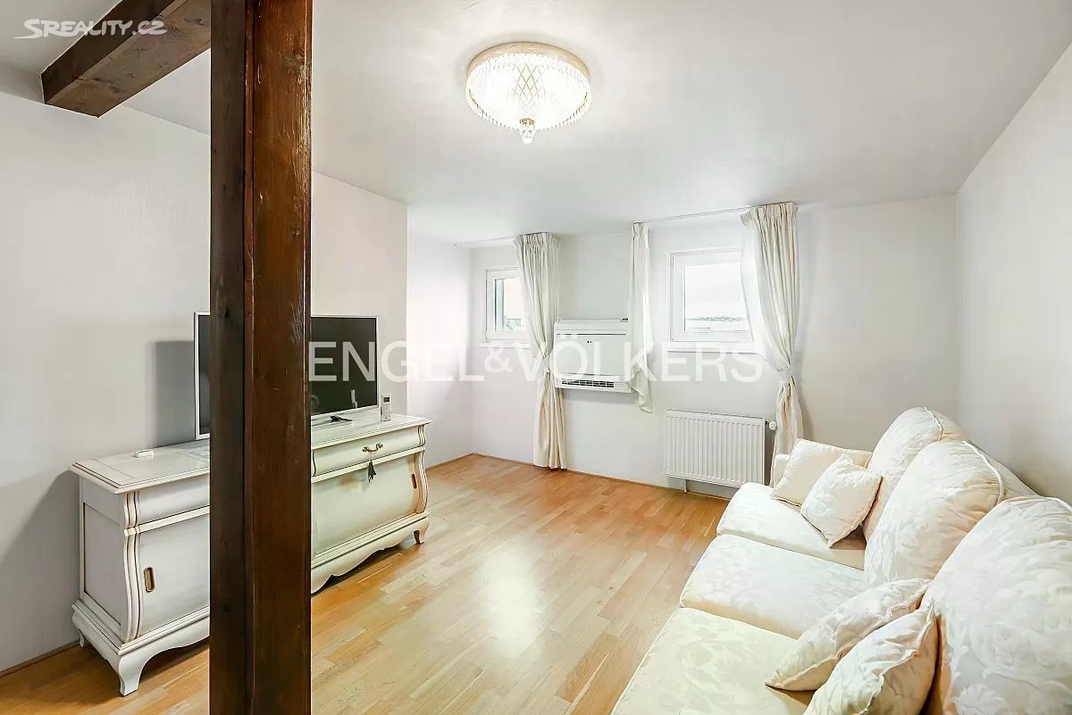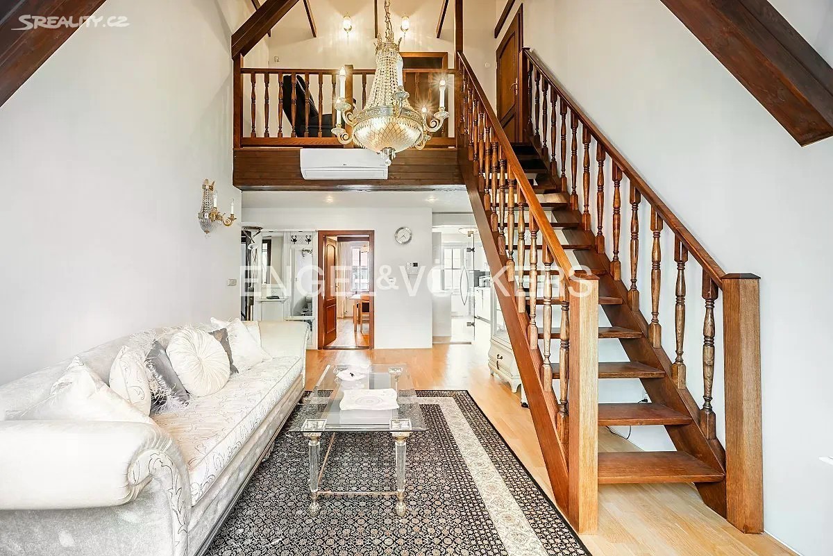 Mezonetový byt 4+kk se nachází v sedmém, posledním nadzemním podlaží cihlového činžovního domu v srdci Karlína. V prvním patře se nachází samostatná ložnice, pokoj, který aktuálně slouží jako jídelna, koupelna se sprchovým koutem a prostorný obývací pokoj s plně vybavenou kuchyní se spotřebiči vysokého standardu, oddělenou skleněnou zástěnou. Ve druhém patře je další samostatný pokoj a koupelna s vanou a malou komorou. Byt je vybaven klimatizací. Dům disponuje výtahem. Parkovací stání na dvoře je možné si pronajmout za příplatek. Pronájem je možný ihned.