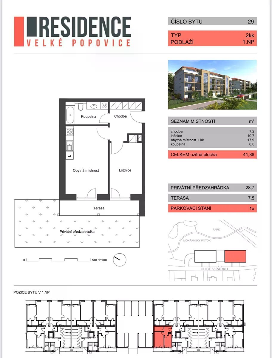 Nabízím k prodeji moderní byt 2+kk s vlastní předzahrádkou 36 m2 v novostavbě umístěné v atraktivní lokalitě Velkých Popovic, kousek od Prahy. Developerský projekt z roku 2019 v blízkosti krásného parku. Užitná plocha bytu činí 42 m2, optimální velikost pro jednotlivce, pár nebo menší rodinu. Byt je částečně vybaven, což umožňuje novým majitelům přizpůsobit si interiér podle svých představ a potřeb. Velkou výhodou je vlastní předzahrádka, která poskytuje možnost relaxace na čerstvém vzduchu. Vytápění obstarává podlahové topení napojené na centrální plynovou kotelnu, byt je energeticky úsporný - energetická třída B. Součástí bytu je také garážové stání, které nabízí bezpečné a pohodlné parkování přímo pod domem. Velké Popovice jsou krásnou obcí s veškerou občanskou vybaveností nedaleko Prahy, jen pár minut od sjezdu z dálnice D1. Okolí láká k aktivnímu trávení volného času, okolní lesy a louky představují pohádku v každém ročním období. Potěší několik metrů vzdálená pivovarská restaurace, kavárna, pekárna a další obchody. Zastávka autobusu, který jede na metro Opatov, je vzdálená pár metrů od domu. Doporučuji prohlídku.