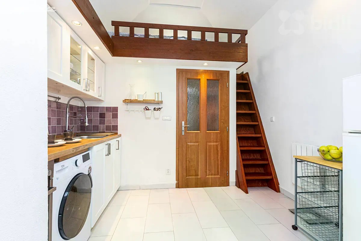 Světlý a účelně řešený byt o výměře 31 m2 (+ cca 7 m2 vestavěné patro) a dispozici 1+kk (+ patro) v srdci pražského Smíchova je ideální jako investiční nemovitost. Díky svému velmi dobrému stavu a poloze přímo u zastávky tramvaje Křížová, výhledu na Vyšehrad i umístění hned naproti nově stavěnému centru Smíchov, stejně jako blízké dostupnosti letiště i veškerého zázemí velkoměsta, je byt vhodný pro krátkodobý i dlouhodobý pronájem. V současnosti je byt volný. Byt je po čerstvé rekonstrukci a je velmi prakticky vyřešený. Na vstupní chodbu navazuje koupelna se sprchovým koutem, umyvadlem, bojlerem a WC. Ve středu bytu je umístěn zcela nový kuchyňský kout vybavený troubou, sklokeramickou deskou, pračkou se sušičkou a dřezem. Směrem k oknům do ulice je situovaný velký a světlý obývací pokoj s rozkládacím gaučem, skříněmi a jídelním koutem. Ložnice je vyřešena jako spací patro nad vstupní částí bytu, což je díky vysokým klenutým stropům pohodlné řešení. Byt je zařízený, vybavení lze přenechat novým majitelům. Byt se nachází v 2. NP činžovního domu v původní cihlové zástavbě. Okna jsou dvojitá, dřevěná špaletová, která dokonale chrání před zvuky z ulice. Vytápění i ohřev vody jsou vlastní, elektrické. Dům je bez výtahu, vprostřed domu je příjemný dvorek a patio, v přízemí společné prostory pro kočárky. Zastávka tramvaje Křížová je první zastávka od metra Anděl, takže veškerá vybavenost je velmi dobře dostupná. Dům je vhodně situovaný i vůči letišti a centru města. Hned naproti se staví nový areál banky i dalších firem, takže nemovitost má velký investiční potenciál i do budoucna a ještě více se v budoucnu funkčně propojí s centrem města.