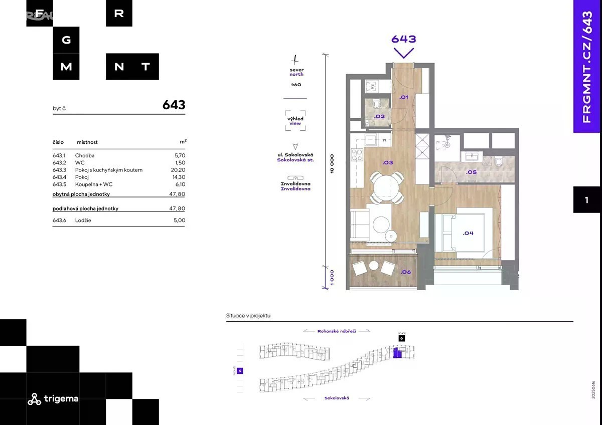 Nabízíme k dlouhodobému pronájmu kompletně zařízený moderní byt 2+kk situovaný ve 4. patře unikátního projektu Fragment v atraktivní lokalitě Praha Karlín. Dispozice bytu: Interiér tvoří obývák s jídelní částí a kuchyňskou linkou se spotřebiči, ložnice s postelí a úložnými prostory, koupelna se sprchovým koutem a toaletou, samostatná toaleta a vstupní chodba. K bytu náleží lodžie o velikost 5 m2. Vybavení a standardy: • Chytrá domácnost LOXONE • Vytápění a chlazení bytu skrze stropní podhledy • Vzduchotechnika s rekuperací • Variabilní osvětlení bytů • Velkoformátová okna • Venkovní rolety • Kvalitní dřevěné podlahy • Vestavěné skříně • Spotřebiče: pračka+sušička, myčka, indukční varná deska, digestoř, pečící trouba, mikrovlnná trouba, lednice + mrazák • Wellness WC s bidetovou sprškou • Internetové připojení Další informace: • Poplatky za služby a zálohy za energie se hradí zvlášť • Garážové stání k dispozici za poplatek 2 700 Kč / měs. + DPH • Sklepní kóje k dispozici za poplatek od 800 Kč / měs. + DPH • V budově je 24/7 recepce / ostraha, kamerový systém • Obchody a služby v budově - fitness centrum, kavárna, restaurace, drogerie, květinářství, kadeřnictví, zubní klinika, galerie Provize se neplatí. Dostupnost: K nastěhování od 17.11.2025.