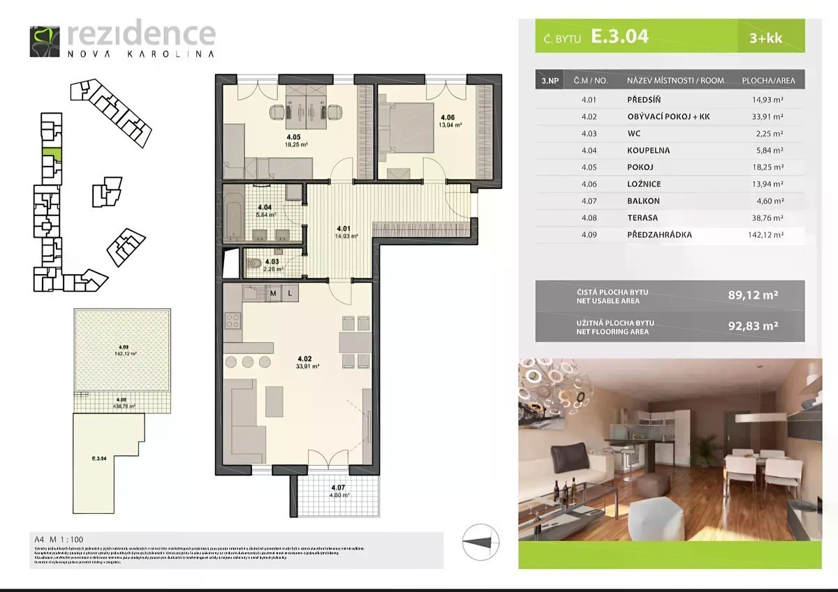 Nabízíme Vám pronájem zařízeného bytu o dispozici 3+kk v rezidenci Nová Karolina. Podlahová plocha apartmánu je 89,12 m2, balkón (4,6 m2), terasa se zahradou (181 m2) má zavlažování a robotickou sekačkou. Pokoje jsou neprůchozí. Součástí kuchyňské linky je nová myčka nádobí, sklokeramická varná deska s digestoří, elektrická a mikrovlnná trouba, nerezový dřez a lednice s mrazákem. V obytném prostoru jídelní stůl se židlemi, TV stolek s televizí, rohová sedací souprava s konferenčním stolkem. V ložnicích jsou postele se stolky a vestavěné skříně. Koupelna má vanu, dvěm umyvadla a pračka, toaleta samostatně. Na chodbě rovněž další vestavěné skříně. Možnost pronájmu i další garážové stání. Veškerá občanská vybavenost v bezprostřední blízkosti. Pro více informací a sjednání prohlídky nás neváhejte kontaktovat.