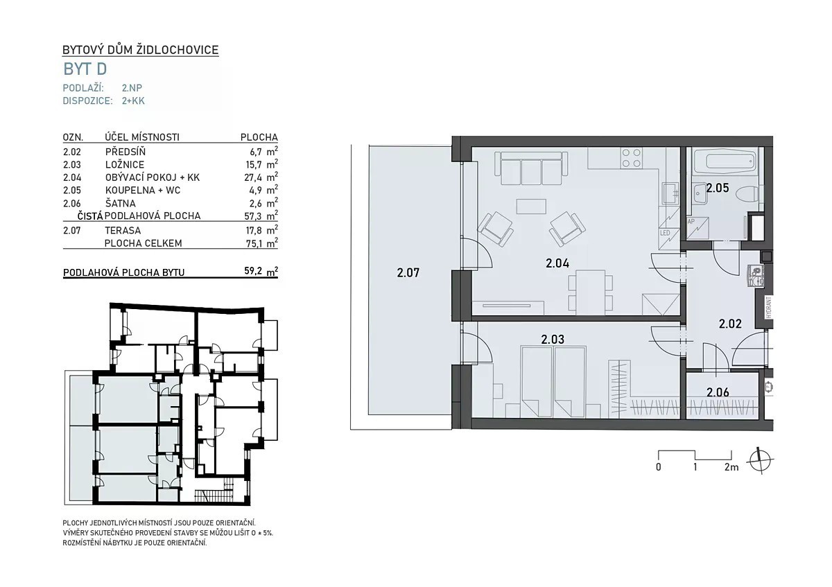 Nabízímek prodeji byt kategorie 2+kk o velikosti 61,6 m2 + 6,0 m2 lodžie. Byt se nachází v novostavbě bytového domu na ulici Masarykova v Židlochovicích. V domě, který bude mít tři nadzemní podlaží, bude vybudováno celkem 12 bytových jednotek o velikosti 1+kk až 3+kk s balkony, terasami a zahrádkou, dva vinné sklepy a dvě garáže. Dále budou ve dvorní části vystavěna parkovací stání pro 10 automobilů. Každý byt bude vytápěn samostatným závěsným kondenzačním plynovým kotlem, který zajistí také přípravu teplé vody. K bytu je možné koupit sklep, garáž, parkovací stání pro automobil a parkovací stání pro motocykl. Energetický štítek bude na stupnici „B“ velmi úsporný. Prodej nemovitostí je určen do osobního vlastnictví. Pořízení bytu v tomto domě doporučujeme, jak k trvalému bydlení, tak na investici. K financování koupě bytu je možné využít také hypotéční úvěr.