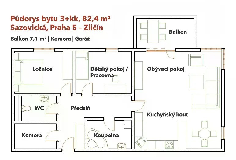Nadčasový městský byt s precizní dispozicí. 6. podlaží, výtah, plná světlost díky rohovým francouzským oknům a plynulému „open-plan“ propojení kuchyně, jídelny a lounge. Všechny pokoje neprůchozí, jasná denní/noční zónace. Interiér & vybavení (turn-key): - Obytná zóna s velkorysou sedací soupravou v „soft-beige“ tónu, jídelní set; vizuální osu tvoří čisté linie kuchyně s plně integrovanými spotřebiči, kompaktními horními skříňkami a pracovní plochou v jednolitém dekoru. - Dvě ložnice připravené k okamžitému užívání: plně vybavené kvalitním nábytkem včetně postelí a šatních prvků; vybavení je k dispozici, i když není uvedeno na fotografiích. - Předsíň jako funkční „úložné jádro“: velkoformátové zrcadlo ve vestavěné skříni opticky rozšiřuje prostor. - Koupelna s rohovou vanou, rektifikovanou keramikou a podlahovým vytápěním; samostatné WC s umývátkem. - Venkovní elektrické žaluzie pro řízení mikroklimatu, bezpečnostní vstupní dveře. - Balkon orientovaný do klidné části s gabionovým zábradlím a zahradním setem pro 4 osoby - ideální na snídaňový „sun spot“. - Prádelní kout s pračkou, oddělená komora/šatna - vysoká úložná kapacita bez rušení čisté linie bytu. Privátní garáž 25 m² (extra benefit): uzavíratelný „garage box“ v suterénu domu. Nadstandardní šířka pro SUV/kočárek/kolárnu. Komfort, bezpečí, suchý přestup z výtahu. Pro současnou rodinu téměř nenahraditelné. Lokalita & městské pohodlí (15-min city): Plná občanská vybavenost v pěším dosahu: večerka u domu, MŠ a ZŠ, restaurace, sportoviště, parky Na Prameništi. Metropole Zličín, IKEA, Globus, kino, fitness a služby pár minut chůze. Metro B Zličín v docházce, rychlé napojení na Pražský okruh, D5 i letiště. Do centra cca 25 min. Architektonické a designové detaily, které rozhodují: - čisté pravé úhly a „slim“ lišty, které dělají interiér opticky lehkým - jednotná neutrální paleta, snadno kombinovatelná s jakýmkoli stylem (Nordic/Urban/Soft Minimal) - vysoký podíl denního světla, plynulá vizuální prostupnost mezi zónami - stínění „blackout ready“ díky žaluziím - ergonomie kuchyně s logickou pracovní trajektorií (vaření-mytí-odkládání) - hygienické zázemí oddělené na „wet“ a „dry“ část pro rodinný provoz - bezpečný vstup, klidný vnitroblok, minimální hluková zátěž od ulice - balkon jako „second living“ pro mezisezónní pobyt Byt je ideální pro rodinu, která chce kvalitní, praktické a současné bydlení bez kompromisů. Koupi lze financovat i hypotéčním úvěrem. V případě zájmu Vám rádi zajistíme kompletní hypoteční servis. Doporučuji osobní prohlídku.