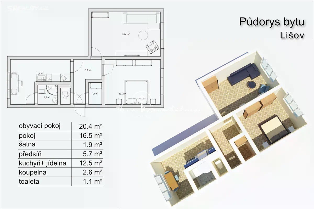 Exkluzivně Vám nabízím byt v osobním vlastnictví v panelovém domě v Lišově. Byt se nachází ve 1. nadzemním podlaží a má výměru 63 m2. Celý dům je po kompletní rekonstrukci - zateplení, plastová okna, výtah. Na každém patře jsou 3 byty. Dispozice bytu je 2+1. Kuchyně je orientována na západ a ložnice s obývacím pokojem jsou orientovány na východ. K bytu náleží sklep. Byt je v původním velmi dobře udržovaném stavu. Koupelna prošla před lety rekonstrukcí. V blízkosti domu je autobusová zastávka a supermarket Trefa. V docházkové vzdálenosti je lékárna, MŠ, ZŠ, pošta a veškerá občanská vybavenost. V případě zájmu o prohlídku mě neváhejte kontaktovat. Ráda Vám pomohu i se zajištěním financování Vašeho bydlení.