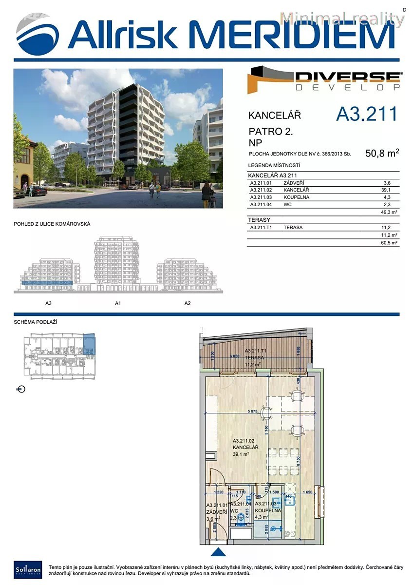 Nabízíme k pronájmu novostavbu kanceláře o dispozic 1+kk o velikosti 50 m², s prostornou terasou 11 m², nacházející se ve 2.NP v prestižním projektu Allrisk MERIDIEM v Komárově na ulici Komárovská. Jednotka o dispozicí 1+kk s opticky odděleným prostorem pro kuchyňskou linku, koupelnou se sprchovým koutem, samostatnou toaletou s umyvadlem a chodbou. Prostorná terasa o ploše 11 m² představuje ideální místo pro relaxaci. V kanceláři je kompletní kuchyňská linka včetně LED osvětlení a vestavných spotřebičů (varná deska, elektrická trouba, digestoř, myčka, lednice s mrazákem). Novostavba je provedena ve vyšším standardu: jsou instalována francouzská okna která zajišťují dostatek denního světla elektricky ovládané předokenní žaluzie klimatizace s dálkovým ovládáním velkoformátová dlažba v koupelně a na toaletě Dynamicky rozvíjející se lokalita nabízí výbornou dostupnost do centra Brna a kompletní občanskou vybavenost v docházkové vzdálenosti (obchody, restaurace, pošta). Výhodou pronájmu je možnost odpočtu DPH. Ihned k dispozici. Pro více informací a sjednání prohlídky mě neváhejte kontaktovat.