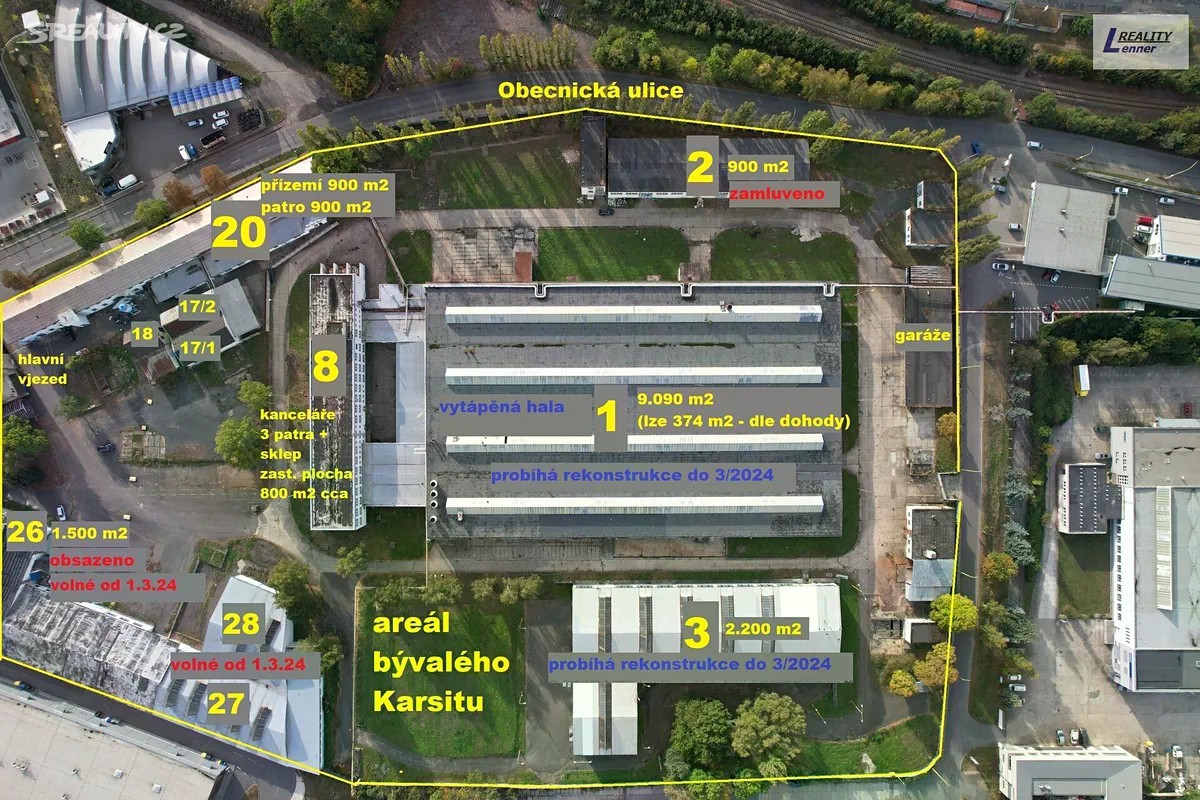 Nabízíme Vám (napřímo bez RK provize) k dlouhodobému pronájmu několik velice prostorných výrobních hal, vč. možností i kanceláří k nim, v průmyslovém areálu Příbrami bývalé firmy Karsit. Jedná se o pronájem několika budov (převážně výrobních hal) a jedné prostorné, třípatrové administrativní budovy. Některé prostory jsou ihned k dispozici, další budou po rekonstrukci do 1.3.2024, event. lze po dohodě upravit. K dispozici jsou nyní: Budova 1 (hala): cca 9090 m2, výška cca 5 m (bude temperovaný, k dispozici 2 jeřáby) viz foto návrh půdorysu rozdělení jednotlivých jednotek v hale) Budova 2 (hala): 900 m2, výška cca 6 m (jeřáb), vytápěné (nyní zamluveno) Budova 3 (hala): 2200 m2, výška cca 9 m (hala do tvaru L) Budova 26 (hala): 1500 m2, výška cca 8 m (volné od 1.3.2024) Budova č. 27+28 (dřevěný strop): cca 1700 m2, výška 4-5m (volné od 1.3.24) Budova č. 20 (kanceláře, hala, 2. patra) s vrátnicí - 2 patra, 2x 900 m2 Budova č. 8 (administrativní budova) - 3 patra + sklep, půdorys cca 800 m2 Budovy (haly) jsou nevytápěné vyjma budovy (haly) č. 1 Budovy (haly) č. 1 a 3 jsou nyní v rekonstrukci, dokončení cca 3/2024. Budova č. 8 (administrativní) - před rekonstrukcí, čeká se na požadavky daného nájemce, bude opravena střecha. V případě rekonstrukce dle požadavku nájemce, kterou by provedl pronajímatel, bude vyšší cena dle dohody smluvních stran. Areál má prostorný vnitroblok s dostatkem ploch kolem budov (hal) kde lze pohodlně manipulovat i s kamiony, vč. možnosti parkování. V areále dále k dispozici i několik prostorný garáží. Smlouva ideálně na 1 rok a více. Nižší doba dle dohody. Kauce dle dohody s pronajímatelem. Provizi RK neplatíte žádnou! Cenu Vám rádi vykomunikujeme napřímo s majitelem, dle dohody. Pro více info kontaktujte RK. EPNB ve třídě G, zatím nemáme k dispozici.