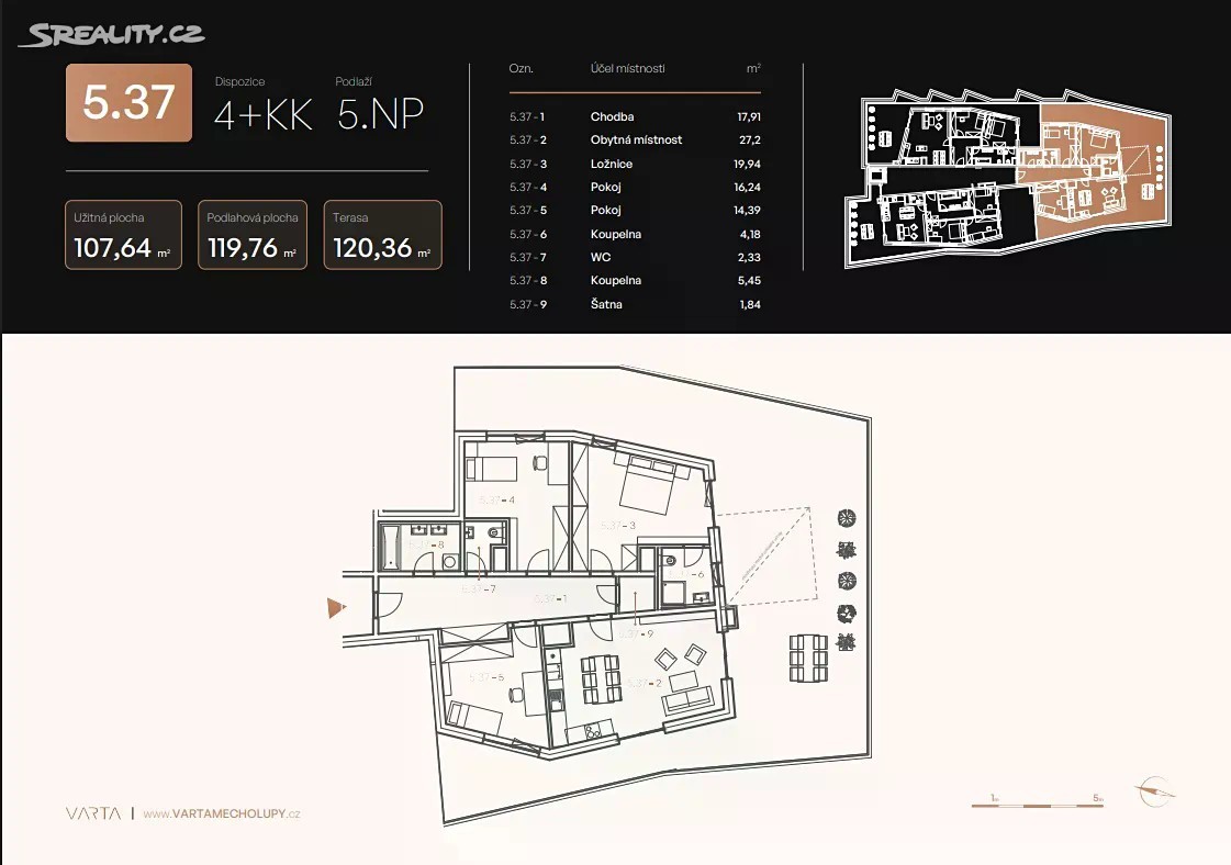 Exkluzivní nabídka - moderní byt 4+kk s velkou terasou v projektu VARTA Měcholupy, Praha 10 Hledáte prostorné, moderní a klidné bydlení s výbornou dostupností do centra Prahy? Pak vás jistě zaujme tento slunný byt 4+kk (119,76 m²) s nádhernou terasou o velikosti 120,36 m², který se nachází v 5. nadzemním podlaží nového rezidenčního projektu VARTA Měcholupy na rohu ulic Boloňská a Milánská. Developer čeká na potvrzení standardů ze strany klienta, můžete si tedy vše dokončit dle vašeho přání. V ceně je zároveň pergola na terase, kde je možnost umístit vířivku. Součástí nabídky je možnost dokoupení sklepa (od 199 000 Kč) a dvou parkovacích stání (od 730 000 Kč). Projekt VARTA Měcholupy představuje komorní rezidenci s důrazem na komfort, kvalitu a úspornost provozu. Příprava na fotovoltaiku, nadstandardní materiály a zpracování, dostatek parkovacích i sklepních prostor, zeleň a klidné prostředí v okolí domu. Lokalita Horní Měcholupy nabízí ideální kombinaci klidného bydlení a skvělé dopravní dostupnosti. V blízkosti najdete kompletní občanskou vybavenost - školy, školky, obchody, restaurace i zastávky MHD. Byt je ihned k nastěhování.