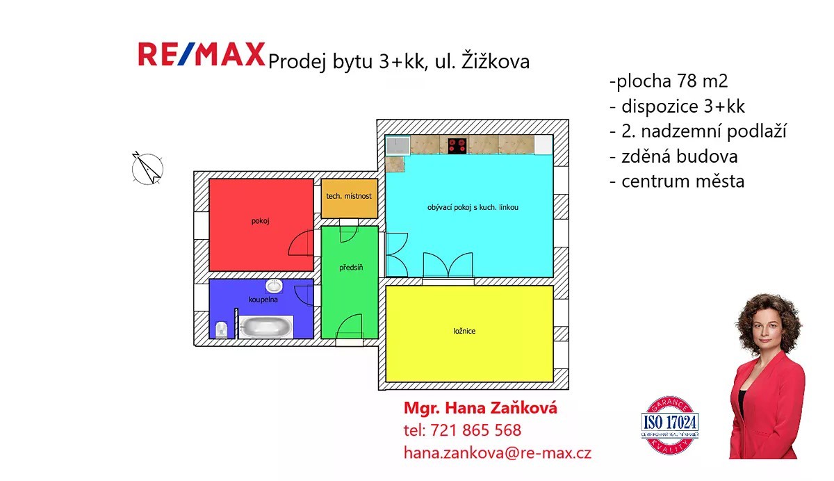 Nabízíme vám k prodeji zděný byt v žádané lokalitě v centru města. Byt o dispozici 3+kk a ploše 78 m2 se nachází ve druhém nadzemním podlaží (1.patře) čtyřpatrové budovy. Do bytu se vchází předsíní (7 m2), ze které je přístup do koupelny (8 m2), pokoje (11 m2), technické místnosti a obývacího pokoje s kuchyňským koutem (29 m2). Kuchyňská linka je osazena dřezem, sklokeramickou varnou deskou a elektrickou troubou, myčkou, digestoří. Obývací pokoj (29 m2) je průchozí, je z ní přístup do ložnice o ploše 20 m2. Obývací pokoj a ložnice jsou orientovány na jihozápad, pokoj a koupelna na severovýchod. V bytě se nachází technická místnost ploše 3 m2, ve které se nachází plynový kotel. Byt je vytápěn plynovým kotlem. Byt bude volný od 1.listopadu. Fond oprav 850,- Kč Energetický štítek na dům nebyl zpracován.