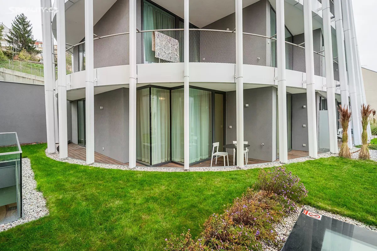 Moderní designový byt 2+kk (1 ložnice, 1 koupelna), s klimatizací, s celkovou plochou 113,63m2, z toho zahrada (24,49m2), terasa (12,3m2) o obytní plocha 76,84m2, je situován ve 2. NP zcela nového luxusního rezidenčního komplexu s výtahem, recepcí, bazénem, saunou, prostornou zahradou ve dvoře, sklepem a možností parkování v podzemním parkovišti. Interiér tohoto bytu zařízen designovým italským nábytkem a dispozičně nabízí vstupní chodbu (5,32m2), krásný obývací pokoj (41,62m2) s plně vybaveným kuchyňským koutem (lednice, mrazák, trouba, myčka, elektrická varná deska, mikrovlnná trouba, digestoř), samostatnou ložnici (12m2) se šatnovým prostorem (6,29m2) s vestavěnými skříněmi, ensuite koupelnou (8,74m2) s vanou, sprchovým koutem, umyvadlem, toaletou a bidetem, a samostatnou toaletu. Výhodou bytu je dostupnost terasy z obou místností. Součástí vybavení bytu je pračka, sušička a TV. K dispozici je také sklep. Budova se nachází v lukrativní části Prahy, vedle parku Sacré Coeur, obklopená luxusními vilami a rezidenčními komplexy, nově postavěnými ve vysokém standardu. Nedílnou součástí čtvrti je historická budova bývalého kláštera Sacré Coeur, který je nyní využíván jako místo pro taneční nebo jiné akce, a klášter sv. Gabriela. Výhodou lokality je výborné situování v blízkosti veškeré občanské vybavenosti, v docházkové vzdálenosti je nákupní centrum Nový Smíchov, kina, široká škála obchodů, restaurací, kaváren a mnoho dalšího. Velmi dobrá dopravní dostupnost MHD, autobusová zastávka "Holečkova" a tramvajová zastávka "Bertramka" se nachází pouhých pár kroků od budovy, stanice metra "Anděl" (linka B) je vzdálena 1 zastávku tramvají. Měsíční poplatky za služby a energie jsou zahrnuty v ceně nájmu 2200 EUR + 12 % DPH. Cena zahrnuje také úklid bytu 2x měsíčně, včetně výměny ložního prádla a ručníků. Členský poplatek wellness (vnitřní bazén 14m a sauna): 2500 Kč měsíčně. Možnost parkování za poplatek 200 € + 21%DPH/měsíc/ za parkovací místo. Kauce: 12měsíční nájmy. Provize RK. Možnost využití fitness Prisma Institut individuální služba, která není součástí poplatků za byt. Pozn: Fotky jsou z jiného bytu v budově ve stejném standardu. Plán odpovídá bytu.