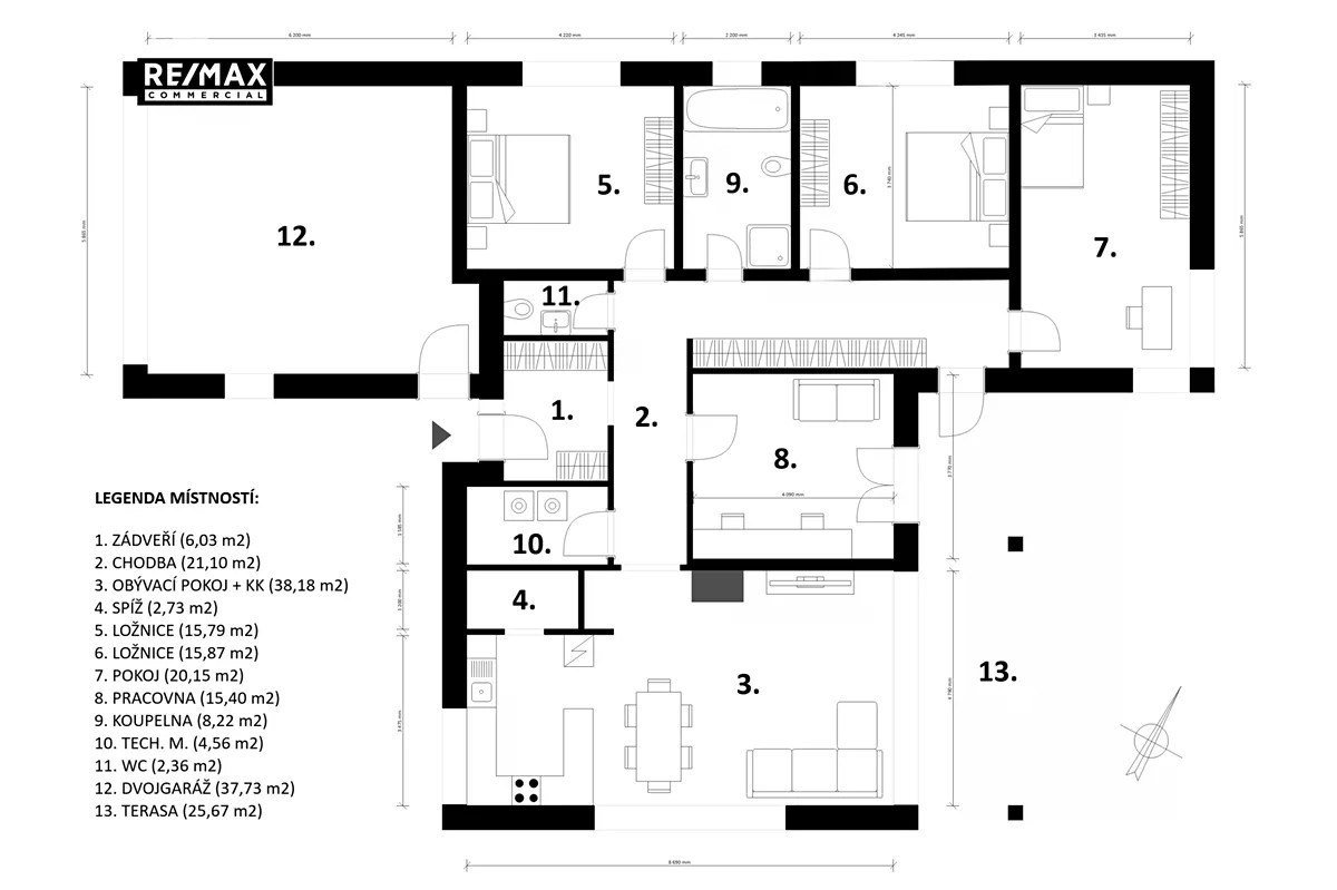Novostavba přízemního rodinného domu o dispozici 5+kk a užitné ploše 225,85 m² (obytná plocha 188,12 m² + garáž 37,73 m²) stojí na pozemku o výměře 930 m² v klidné části obce Sibřina (u Křenice), u Prahy. Nabízí nadstandardní komfort, soukromí a výborné napojení na metropoli. Hlavní přednosti: • Dispozice a velký prostor - dům poskytne dostatek místa vám i celé rodině. Místnosti jsou světlé a s příjemně vysokými stropy. Obývací pokoj navazuje na zastřešenou terasu, kde můžete trávit celé léto. • Zahrada jako oáza klidu - pečlivě udržovaná zeleň, kamenné ohniště, bazén s krytím a terasy. Oplocení a vzrostlá zeleň vytváří naprosté soukromí. Část zahrady je upravená v japonském stylu, kde se můžete ztratit před zraky rodiny a relaxovat. • Zázemí - Dvojgaráž, technická místnost a spižírna, k tomu další objekt sloužící jako dílna na zahradě. • Novostavba bez nutnosti investic - Dům byl dokončen před pár lety, je ve výborném technickém stavu a připravený k okamžitému bydlení. Můžete se tak nastěhovat a nestresovat se dalšími investicemi. Dispozice: Předsíň navazuje na chodbu, ze které je přístup do všech obytných místností. Dominantou je prostorný obývací pokoj s kuchyňským koutem a vstupem na krytou terasu orientovanou na severovýchod. Dále se v domě nachází tři ložnice, pracovna (také se vstupem na terasu), koupelna s vanou a sprchovým koutem, samostatné WC, technická místnost a spižírna. Garáž pro dvě auta je součástí domu. Součástí pozemku je také samostatný objekt (dílna) se dvěma místnostmi (po 11 m²). Technické parametry: Dům je postaven v moderním standardu s důrazem na kvalitu provedení, úsporu energií a dlouhou životnost konstrukcí. Nosné stěny jsou z cihel Porotherm o tl. 30 cm, zateplené 20 cm polystyrenu. Střešní krytinu tvoří betonová taška. Okna jsou plastová s trojskly s předokenními žaluziemi. Vytápění domu je řešeno podlahovým topením v kombinaci s krbem v obývacím pokoji. V každé místnosti je termostat pro individuální nastavení teploty. Garáž je vytápěná pomocí radiátorů, takže ji lze využívat i v zimě. Zdrojem tepla je plynový kondenzační kotel. Dům je napojen na všechny inženýrské sítě - tlakovou kanalizaci, obecní vodovod a plyn. Kamerový zabezpečovací systém zvyšuje pocit jistoty a ochrany majetku. Na zahradě se nachází bazén o rozměrech 8 × 4 metry a hloubce 1,4 metru. Je vybaven posuvným krytím, protiproudem, tepelným čerpadlem a technologií slané vody. Lokalita: Sibřina leží na východním okraji Prahy, v oblíbené rezidenční lokalitě s výborným napojením na hlavní město. Na metro Depo Hostivař nebo Háje dojedete autem za 15 až 20 minut. V okolí je mateřská i základní škola, potraviny, restaurace, sportoviště a cyklostezky. Lokalita tak kombinuje klid venkova a blízkost metropole. Závěr: Další informace Vám makléř rád sdělí po telefonu, formou podrobné prezentace nebo při osobní prohlídce.