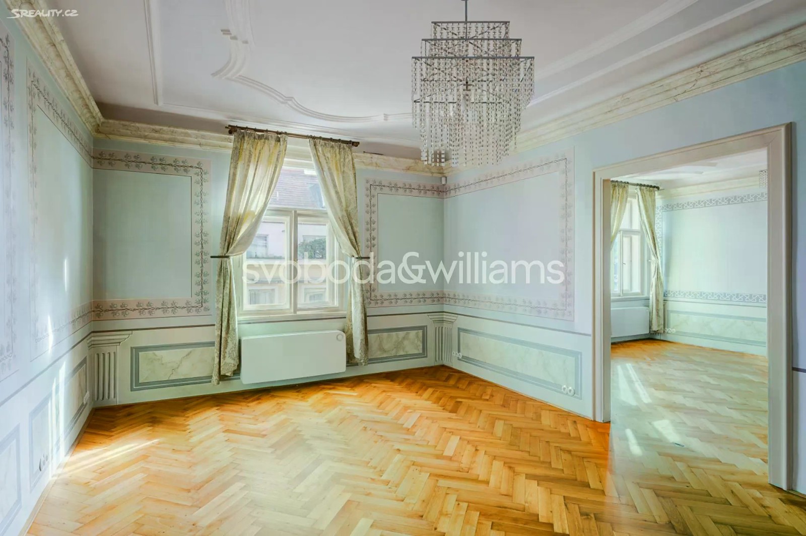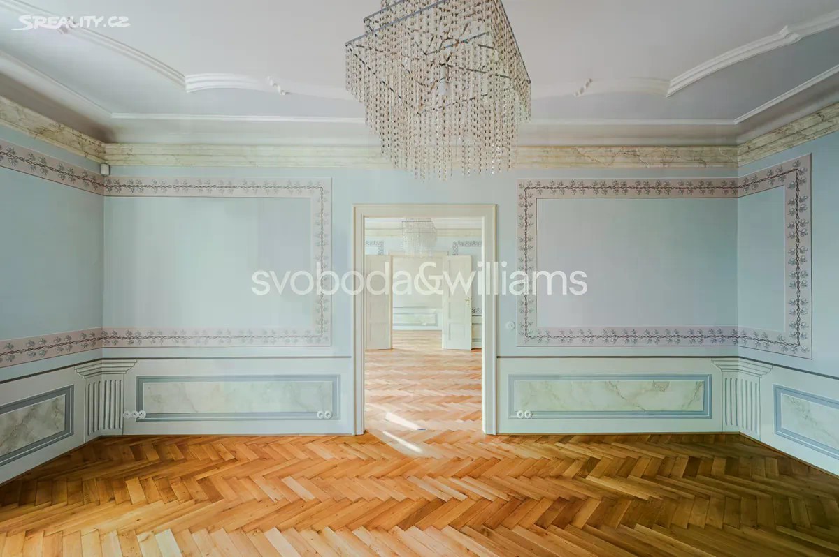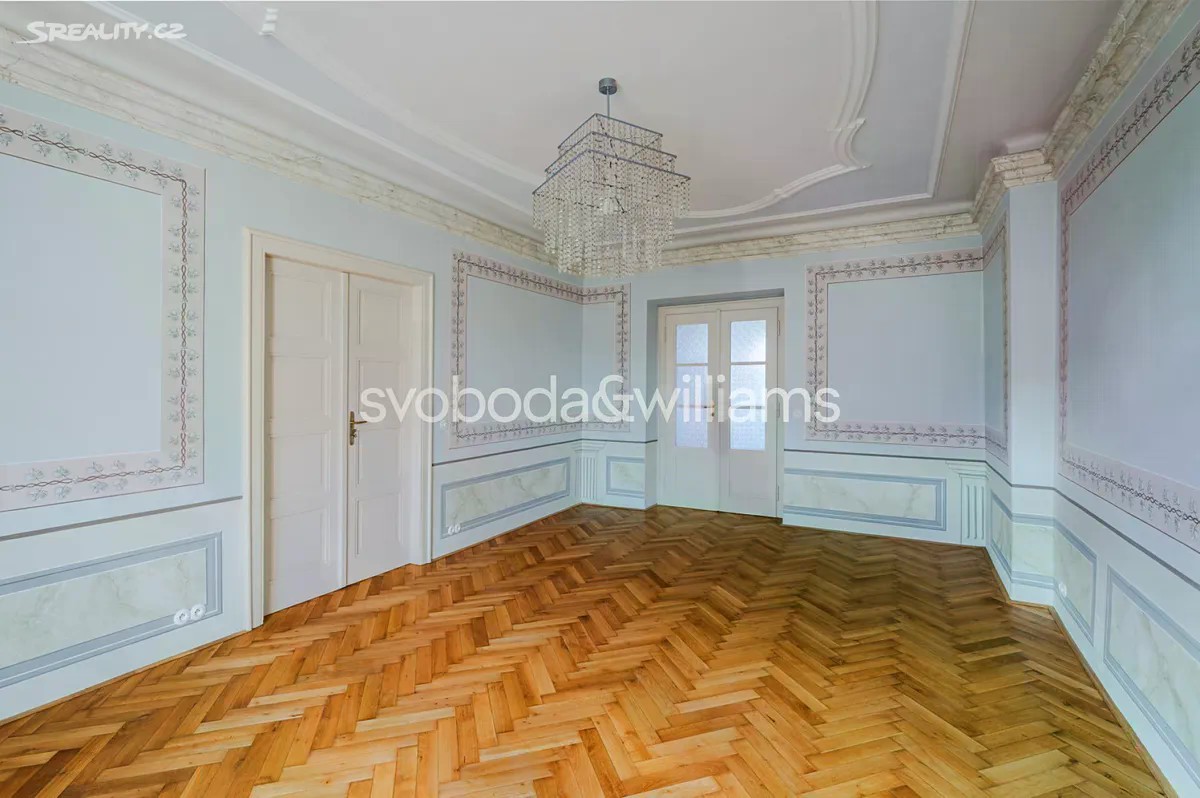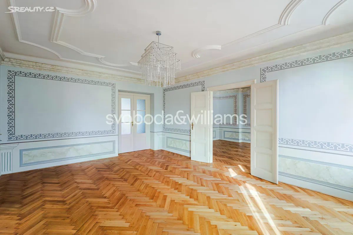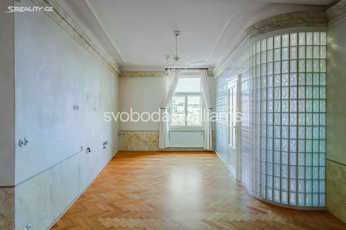 Východem slunce prozářený vzdušný vinohradský byt, jehož stěny a vysoké stropy zdobí štuky a malby akademického malíře, je situován v 6. nadzemním podlaží reprezentativní historické budovy s výtahem ve velice žádané a atraktivní lokalitě Prahy 2, pár minut chůze od stanice metra, Národního muzea, Václavského náměstí i Riegrových sadů. Interiér bytu tvoří 3 prostorné pokoje s okny orientovanými na východ do klidné jednosměrné ulice. Samostatná kuchyně s přípravou pro kuchyňskou linku a elegantní koupelna vybavená vanou, sprchovým koutem, toaletou a dvojumyvadlem jsou orientovány na západ do tichého vnitrobloku. Dispozici doplňuje samostatná toaleta a velká předsíň. Současné uspořádání 3+1 lze upravit na 4+kk. Byt prošel po roce 2014 nákladnou a pečlivou rekonstrukcí. Původní majitel - akademický malíř - vyzdobil interiér štuky a nástěnnými malbami, které byly nedávno restaurovány. Okna byla v roce 2014 repasována, původní parkety obnoveny a doplněny novou dřevěnou podlahou. V koupelně byly použity velkoformátové obklady a dlažba a instalováno podlahové topení. Vytápění zajišťuje kondenzační plynový kotel v kombinaci s radiátory. Komfort bydlení zvyšuje protihluková stěna sousedící s vedlejším bytem a elektronický zabezpečovací systém. Nádherné společné prostory rohového domu i jeho fasáda prošly postupnou revitalizací, budova je součástí památkově chráněného území. Výhodná poloha nadchne pěší dostupností historického centra města, blízkostí Václavského náměstí s jeho nákupními i společenskými možnostmi a perfektním pokrytím městskou hromadnou dopravou. Rodiny s dětmi uvítají blízkost několika mateřských škol, základní i střední školy nebo oblíbených Riegrových sadů s dětským hřištěm, plaveckým bazénem a sokolovnou. Podlahová plocha 130,2 m2.