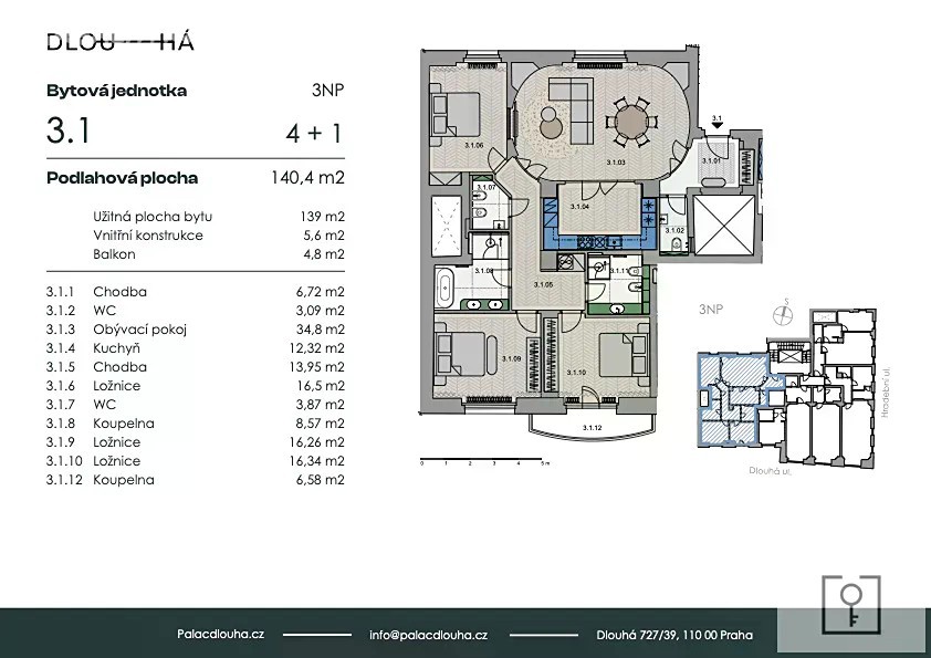 Exkluzivní byt 4+kk o rozloze 140,4 m², který kombinuje historickou atmosféru s moderním komfortem. Tento jedinečný prostor vyniká prostorným obývacím pokojem s kuchyňským koutem (47,12 m²), který je ideální pro pohodlný rodinný život i reprezentativní setkání. K dispozici jsou tři samostatné ložnice (16,5 m², 16,26 m², 16,34 m²), které nabízejí dostatek soukromí a klidu. Dvě koupelny a dvě samostatná WC spolu s prostornými chodbami zajišťují maximální pohodlí. Příjemným doplňkem je balkon (4,8 m²) orientovaný do klidného vnitroblocku, který nabízí prostor k relaxaci. Byt se nachází ve 3. patře pečlivě zrekonstruovaného historického domu s vysokými stropy a velkými okny, která propouštějí do interiéru spoustu denního světla a vytvářejí tak vzdušnou atmosféru. Byt je prodáván v režimu shell & core, což umožňuje novému majiteli dokončit interiér podle svých představ. Na přání je možné interiér kompletně dovést do finální podoby. Palác Dlouhá představuje jednu z nejprestižnějších adres v Praze. Okolí je bohaté na prvotřídní restaurace, stylové kavárny, galerie, butiky a významné kulturní instituce. Výborná dopravní dostupnost metra, tramvají i blízkost Staroměstského náměstí zajišťují snadnou dostupnost a pohodlný městský život. Tento byt je ideální volbou pro náročné rodinné bydlení nebo jako investice s vysokým potenciálem v srdci historické Prahy.