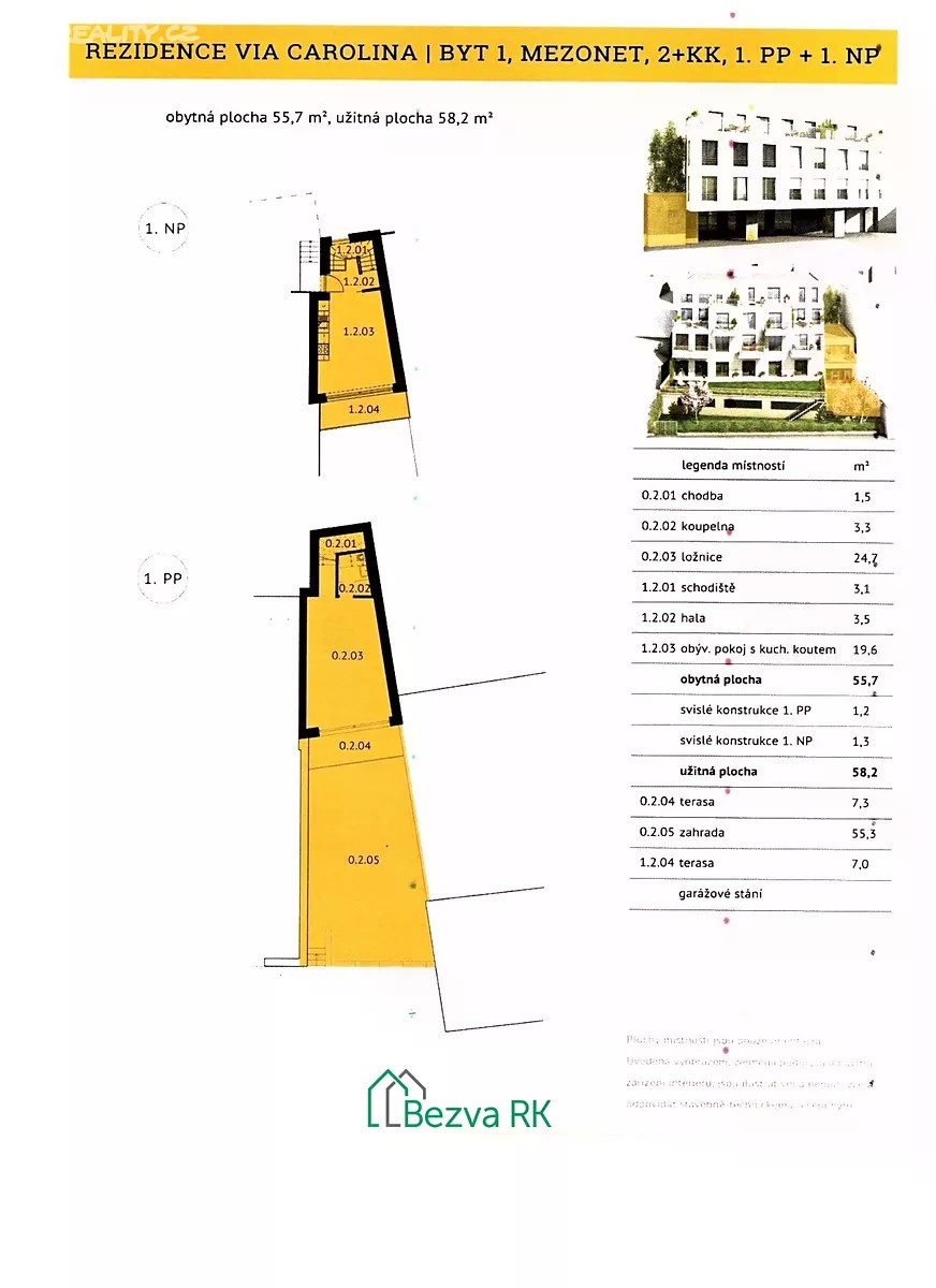 Mezonetový byt s dispozicíčně 2+kk, užitnou plochou 58,2 m2 a podlahovou plochou 88m2 v projektu Via Carolina. Byt disponuje halou, obývacím pokojem spojeným s kuchyňským koutem, ložnicí, schodištěm, koupelnou s WC, dvěma terasami, zahradou a garážovým stáním. Via Carolina: Projekt Via Carolina se nachází v nádherné lokalitě v Praze 6. V bytovém bezbariérovém domě s vlastním výtahem se nachází 9 bytových jednotek, dispozičně 2+kk, 3+kk,4+kk s balkony, terasami či předzahrádkami, s možností parkování na krytých parkovacích stáních v přízemí bytového domu či venku přímo u domu. V přízemí domu se nachází i velký nebytový prostor. Tento projekt je vhodný nejen pro rodiny, páry či jednotlivce, ale také jako výborná investiční příležitost. Projekt Via Carolina je velmi energeticky úsporný, jsou zde použity progresivní technologie a materiály. Zdrojem tepla jsou dvě silná tepelná čerpadla, doplněná podlahovým topením a chlazením s rekuperací v bytech. Vysoký komfort a úroveň bydlení zajišťují dřevohliníková okna s izolačním trojsklem s venkovními žaluziemi. Úžasná lokalita se skvělou dopravní dostupností: Pražská čtvrť Břevnov a zejména pak Bílá Hora, nabízí unikátní a neopakovatelný výhled na panorama hlavního města. Kompletní občanská vybavenost s množstvím obchodů v docházkové vzdálenosti a vynikající dopravní dostupnost, díky níž jste do dvaceti minut v samém srdci Prahy nebo na letišti Václava Havla. Bezprostřední blízkost parku Ladronka, obory Hvězda, letohrádku Hvězda, Břevnovského klášteru s pivovarem, koupaliště Petynka, Džbán, Divoká Šárka a lesopark Řepy. To vše činí z Břevnova jedno z nejprestižnějších míst pro rezidenční bydlení. Bydlení v tomto projektu si zamilujete, ať už jste vyznavačem aktivního způsobu života v čistém přírodním prostředí nebo manažerem pracujícím v kanceláři v centru města, protože jak do přírody tak do centra města se dostanete stejně rychle. V tomto výjimečném projektu nabízíme i další typy bytů. Více na našich stránkách.