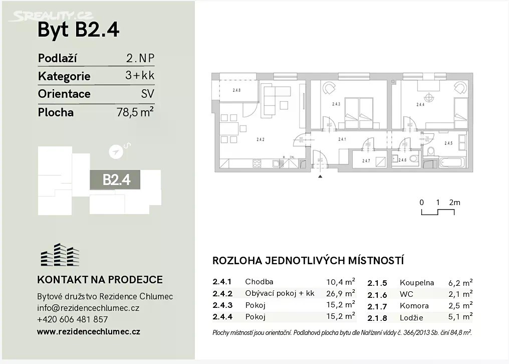 Nabízíme k prodeji byt v novostavbě v projektu Rezidence Chlumec. Bytový dům se nachází v klidné části Chlumce nad Cidlinou ul. Komenského. Nabízíme k prodeji byt č. 2.4 o velikosti 3+kk, 78,5 m2 + lodžie o celkové velikosti 5,1 m2. Jedná se o byt ve druhém patře čtyř patrového bytového domu s výtahem. Byt je vybaven vinylovou podlahou, dlažbou a obklady v koupelně a WC, obložkové interiérové dveře, bezpečnostní vstupní dveře, kompletní elektroinstalace, omítky. Cena družstevního podílu 1 539 750 Kč. Po nastěhování do bytu se hradí měsíční splátka bytu ve výši 23 295 Kč po dobu 30 let. Celková cena bytu: 6 159 000 Kč. Druhou možností je byt uhradit ve vyšší částce až do výše hodnoty bytu (v tomto případě 6 159 000 Kč) a po pěti letech je možné byt převést do osobního vlastnictví. V případě složení výši částky než 25% hodnoty bytu se samozřejmě měsíční splátka sníží. Možnost po 5 letech byt převést do osobního vlastnictví. Předpokládaný termín stěhování leden 2026. Tyto byty jsou i výborným investičním záměrem. Vytápění a ohřev vody je v domě zajišťován tepelným čerpadle, což zajišťuje nízké provozní náklady. V okolí veškerá občanská vybavenost, centrum města je v docházkové vzdálenosti, základní škola, mateřská škola, zámek, sportovní hřiště, vlakové a autobusové nádraží.