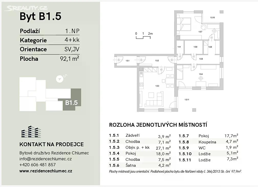 Nabízíme k prodeji byt v novostavbě v projektu Rezidence Chlumec. Bytový dům se nachází v klidné části Chlumce nad Cidlinou ul. Komenského. Nabízíme k prodeji byt č. 1.5 o velikosti 3+kk, 92,1 m2 + 2x lodžie o celkové velikosti 12,4 m2 a soukromou předzahrádkou o výměře 215,8 m2. Jedná se o byt v prvním patře čtyř patrového bytového domu s výtahem. Byt je vybaven vinylovou podlahou, dlažbou a obklady v koupelně a WC, obložkové interiérové dveře, bezpečnostní vstupní dveře, kompletní elektroinstalace, omítky. Cena družstevního podílu 2 137 250 Kč. Po nastěhování do bytu se hradí měsíční splátka bytu ve výši 32 335 Kč po dobu 30 let. Celková cena bytu: 8 549 000 Kč. Druhou možností je byt uhradit ve vyšší částce až do výše hodnoty bytu (v tomto případě 8 549 000 Kč) a po pěti letech je možné byt převést do osobního vlastnictví. V případě složení výši částky než 25% hodnoty bytu se samozřejmě měsíční splátka sníží. Možnost po 5 letech byt převést do osobního vlastnictví. Předpokládaný termín stěhování leden 2026. Tyto byty jsou i výborným investičním záměrem. Vytápění a ohřev vody je v domě zajišťován tepelným čerpadle, což zajišťuje nízké provozní náklady. V okolí veškerá občanská vybavenost, centrum města je v docházkové vzdálenosti, základní škola, mateřská škola, zámek, sportovní hřiště, vlakové a autobusové nádraží. V případě zájmu, dotazů kontaktujte p. Marka Frka.