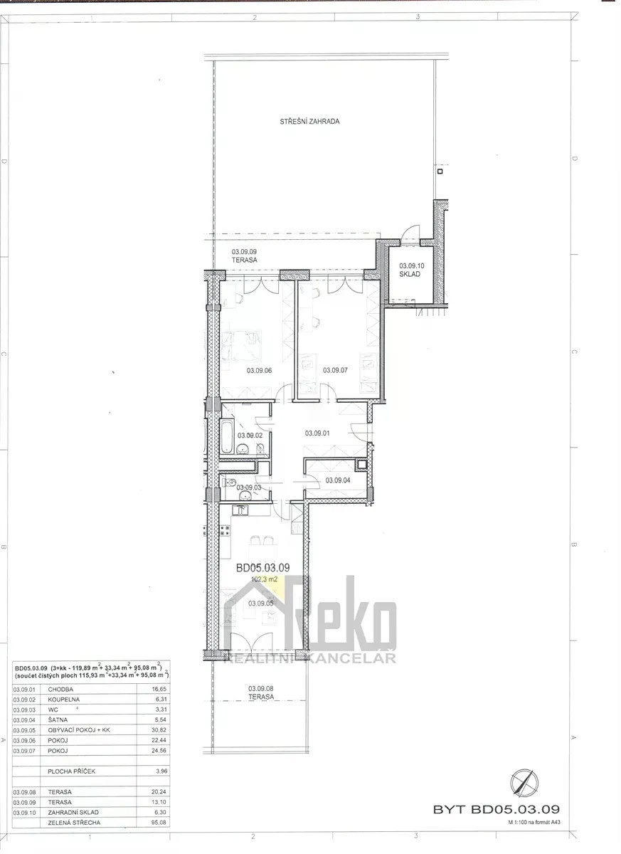 Zprostředkujeme prodej bytu o dispozici 3+kk s výměrou 115,35 m2 a dvěma terasami 71,50 m2 v žádané lokalitě v Berouně "Na Máchovně", s jehož výstavbou se započalo v září 2023 a bude dokončeno v prosinci 2025. V bytě, umístěném v 4.NP bytového domu je obývací pokoj s kuchyňským koutem, dva samostatné pokoje, šatna, chodba, samostatné WC a koupelna. V koupelně umyvadlo, akrylátová vana a otopný žebřík, na podlaze dlažba. Okna plastová, laminátové plovoucí podlahy. K bytu náleží sklepní kóje a garážové parkovací stání. Dům je bezbariérový s výtahem. Velmi dobrá dostupnost na Prahu a nájezd na dálnici D5. Veškerá občanská vybavenost v místě. Výstavba navazuje na již úspěšně realizované a prodané projekty I. - IV. etapy.