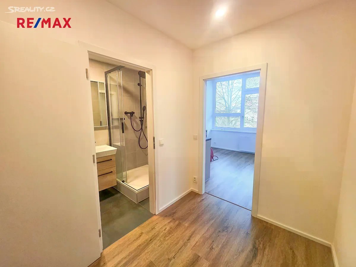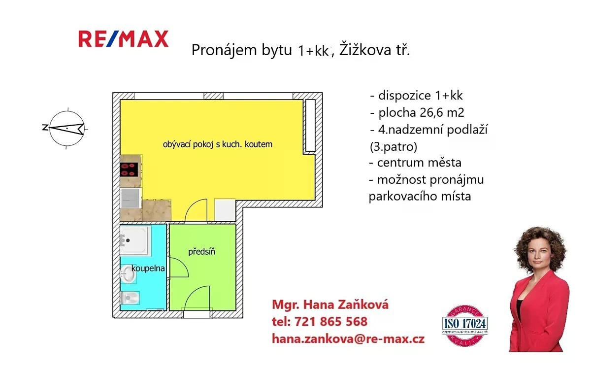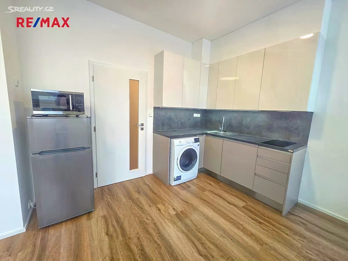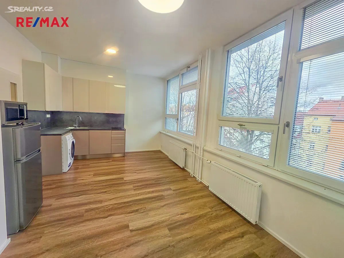 Nabízíme k pronájmu zrekonstruovaný byt 1+kk, umístěný v 3 NP multifunkční budovy v žádané lokalitě v blízkosti centra města v ulici Žižkova. Byt s dispozicí 1+kk (26,6 m2) je situován v nově kompletně zrekonstruovaném multifunkčním domě s výtahem, v lokalitě s veškerou občanskou vybaveností, skvělou dostupností MHD a v centru města. Do bytu se vstupuje předsíní (4 m2), ze které je vstup do pokoje s kuchyňským koutem a do koupelny. Pokoj s kuchyňským koutem o ploše 20 m2 je orientován na východ a je osazen kuchyňskou linkou s dřezem, sklokeramickou varnou deskou, troubou, myčkou, pračkou, mikrovlnnou troubou a ledničkou s mrazákem. Koupelna má plochu 3 m2 a je osazena sprchovým koutem, umyvadlem, otopným žebříkem a WC. V případě potřeby je k dispozici recepce v areálu. V případě zájmu lze k bytu pronajmout parkovací místo na dvoře domu za 1.452,- Kč/měsíc Byt je vhodný pro pracující nekuřáky bez domácích mazlíčků. Nájemné 10.700,- Kč + zálohy na energie (elektřina, voda, teplo) a služby 3.080,- Kč/měs. Vratná kauce 27.560,- Kč. Poplatek RK 10.700,- + 21% DPH (část platí pronajímatel). Byt volný ihned.