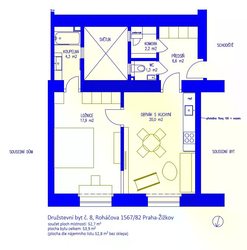 Dovolujeme si Vám nabídnout k prodeji družstevní byt 2+kk o velikosti 53,9 m2 ve 2. patře (3. NP) cihelného domu v Roháčově ulici na Žižkově. Dům byl postaven v roce 1928. Vzhledem k poloze v širším centru města jsou v lokalitě veškeré služby, zastávky MHD i parky (Parukářka, Vítkov, Krejcárek, Židovské pece). Ulice je klidná. Byt má dispozici ideální pro pár nebo single osobu. Má prostornou předsíň (6,6 m2), obývák s kuchyní (20,0 m2), ložnici (17,9 m2), ze které je vstup do koupelny (4,3 m2) a samostatný záchod a komoru (2,2 m2), které jsou přístupné z předsíně. Obě obytné místnosti jsou propojeny interiérovým oknem, díky kterému byt působí větším a prosvětlenějším dojmem. Okna obytných místností jsou orientována do ulice s výhledem na stromořadí. V bytě byla právě dokončena celková rekonstrukce provedená ve vysokém standardu - nové omítky, podlahy z dubových parket a přírodního marmolea, nové truhlářské dveře s masivu vč. dveří vstupních, nová kuchyňská linka (dřez, sporák, myčka; troubu a lednici si nový majitel zajistí sám nebo lze po domluvě objednat u nás). Koupelna je vybavena vanou s možností osazení skleněné zástěny pro sprchování. Příprava pro pračku a sušičku je v komoře. Byt je tichý. Příčka k sousednímu bytu byla z akustických důvodů zesílena předstěnou, okno mezi pokoji je osazeno speciálním akustickým sklem proti přenášení hluku a je možné je zatemnit roletou nebo závěsem. Uvnitř bytu byla provedena kompletně nová elektroinstalace včetně rozvodů datové sítě, rozvody vody a kanalizace. Vytápění všech místností je podlahové elektrické (topné kabely), v koupelně je navíc žebřík. V pokojích je možnost doplnění přímotopných panelů pod okna, což ovšem není z hlediska topného výkonu nutné (podlahové vytápění stačí). Přípravu teplé vody zajišťují dva elektrické bojlery (v koupeně a pod dřezem). Do bytu je možné zavést optický kabel pro internet. Okna jsou dřevěná vybavená trojskly. Dům je dobře spravován - stoupačky elektřiny, vodovodu i kanalizace jsou nové, před cca 10 lety byl proveden výtah. Vnitřní společné prostory jsou čisté a vkusné se zachovaným původním teracovým schodištěm. K bytu zatím není sklepní kóje, družstvo jejich realizaci chystá v prostorech suterénu. Měsíční poplatky družstvu jsou celkem 3.148 Kč, které zahrnují nájemné, vodné + stočné, úklid společných prostor, svoz odpadu, náklady na výtah a společnou elektřinu. Elektřinu si bude hradit vlastník sám. Do šesti minut chůze jsou dostupné zastávky autobusu a tramvaje (Biskupcova pro směr do centra přes Želivského nebo hlavní nádraží nebo Černínova pro směr na Florenc). V bezprostředním okolí je též cyklostezka A257 na Vítkově a pěší tunel do Karlína. Cena zahrnuje veškeré právní služby.